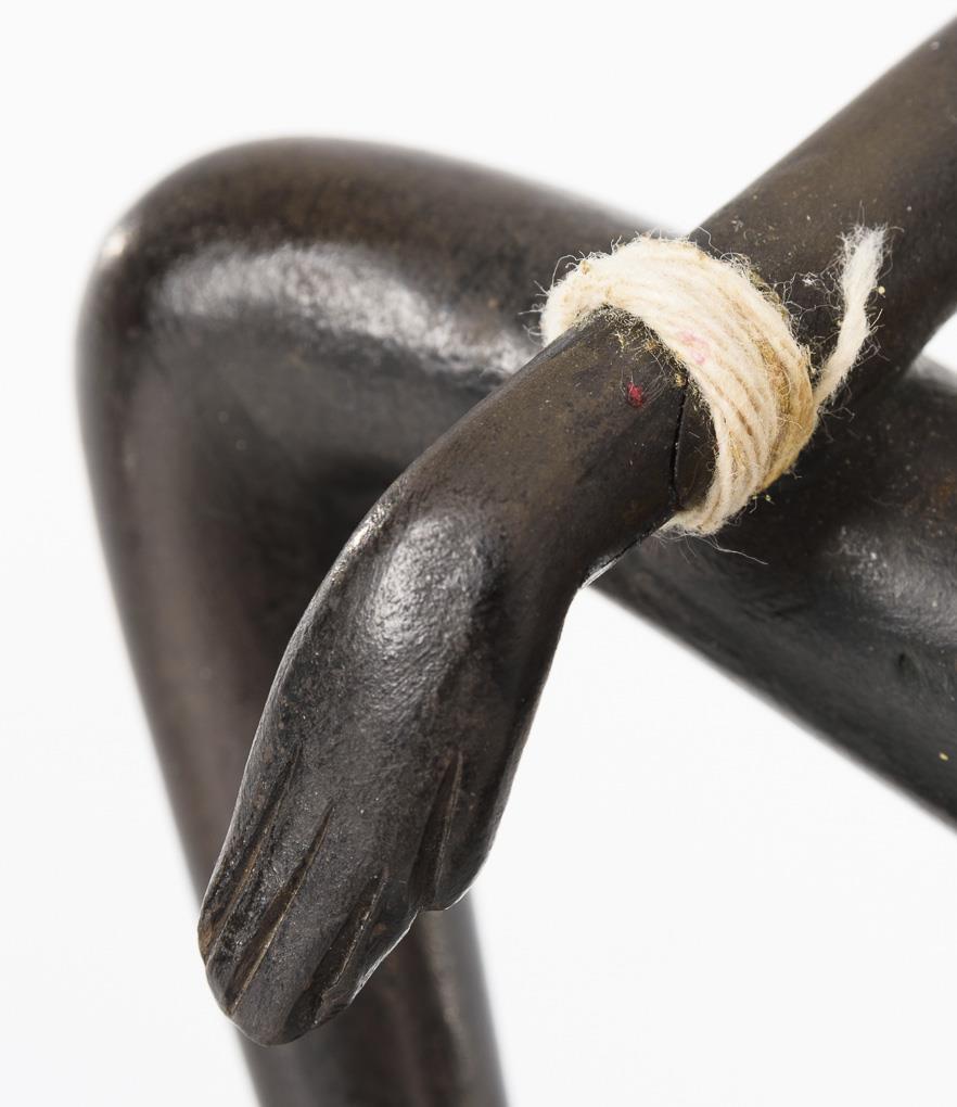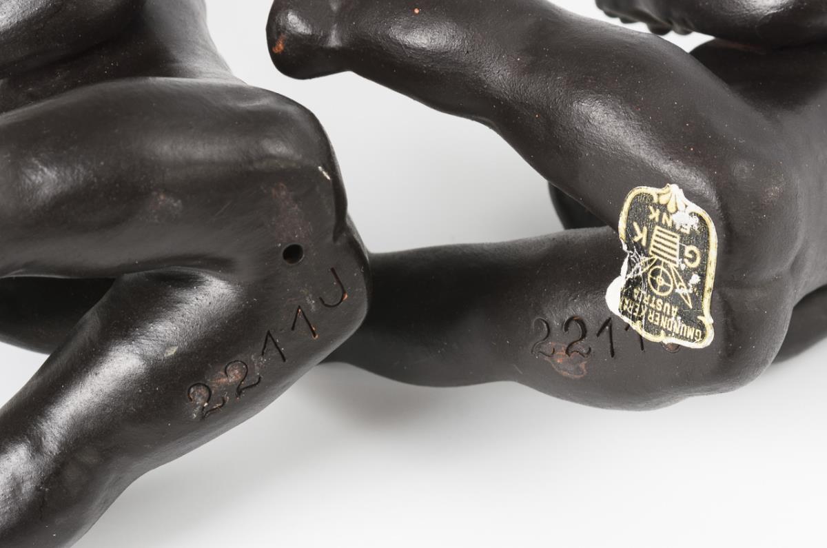 African woman kneeling in a dancing posture with bast skirt, on flat base, design: Leopold Anzengruber (1912 - 1979), h 18,5 cm. Pair of small figures sitting African children with bananas, h 12.5 cm.