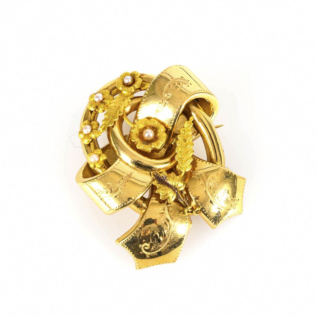 Oval brooch with bow decoration and pearl trim. Hook clasp with tilt lock.