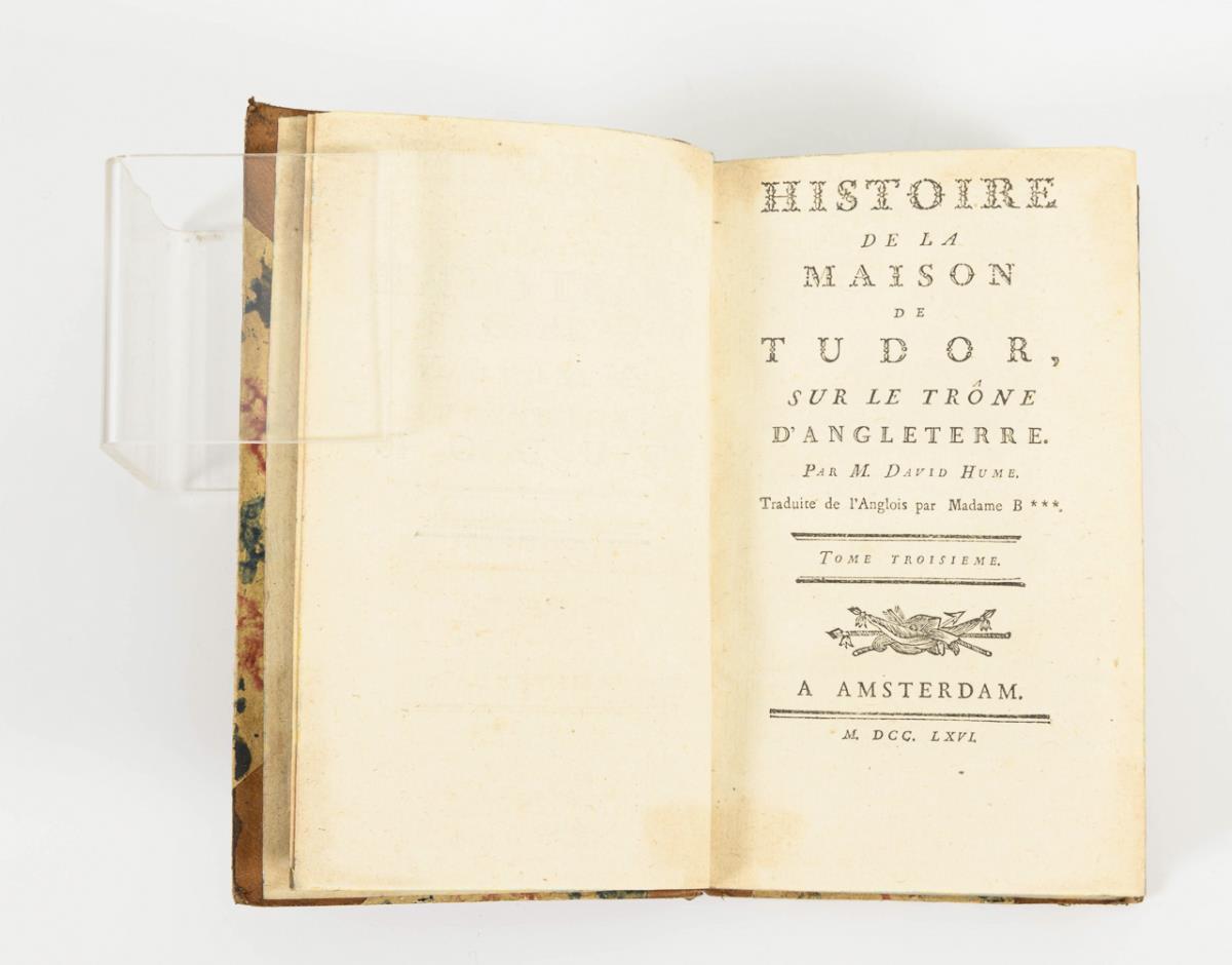 Translated into French by Madame B(elot). Contents cover the period from 1542 to 1603. 480; 328; 395 and 391 pages. All in uniform gilt half leather binding with marbled edges.