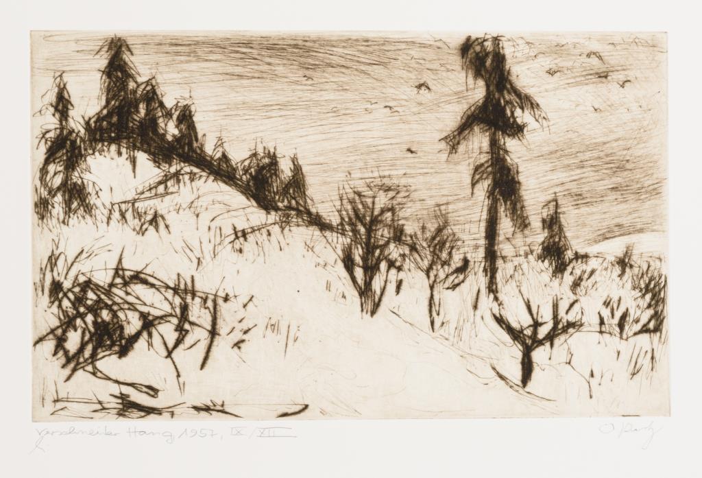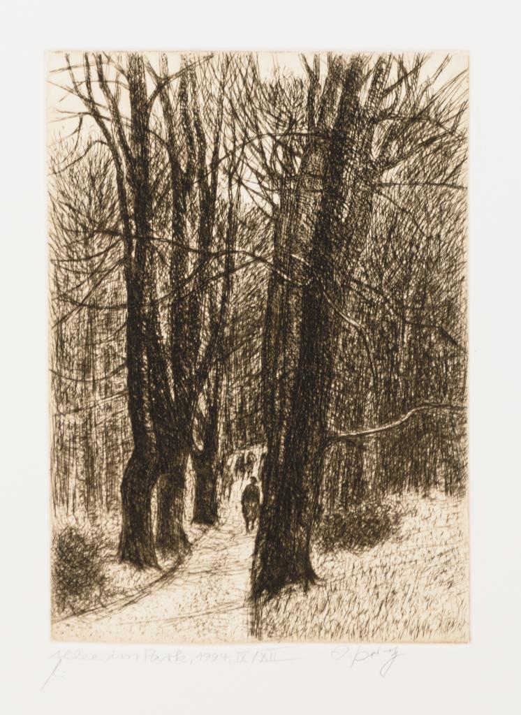 Vollständige Mappe mit 2 Textblättern und 10 Werken: "Im Weimarer Park" (1946), " Bäume im Spätherbst" (1951), "Verschneiter Hang" (1957), "Landschaft mit Radler" (1964), "Alte Weide" (1970), "Lärchenwald" (1975), "Alte Lärche" (1976), "Bäume im Park" (1990), "Allee im Park" (1994) und "Bettelmannseiche" (2000), in grüner Originalmappe mit Prägung.
