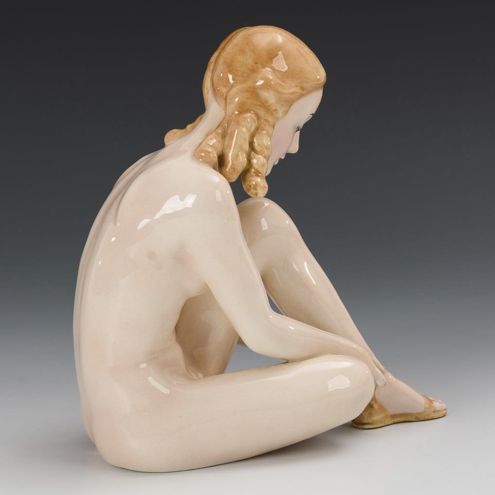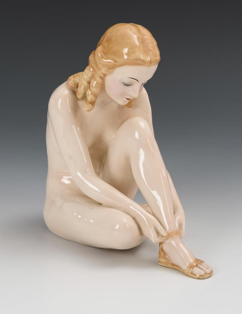 Sitting female nude with curly hair. Slightly bumped on a foot tip and a finger.