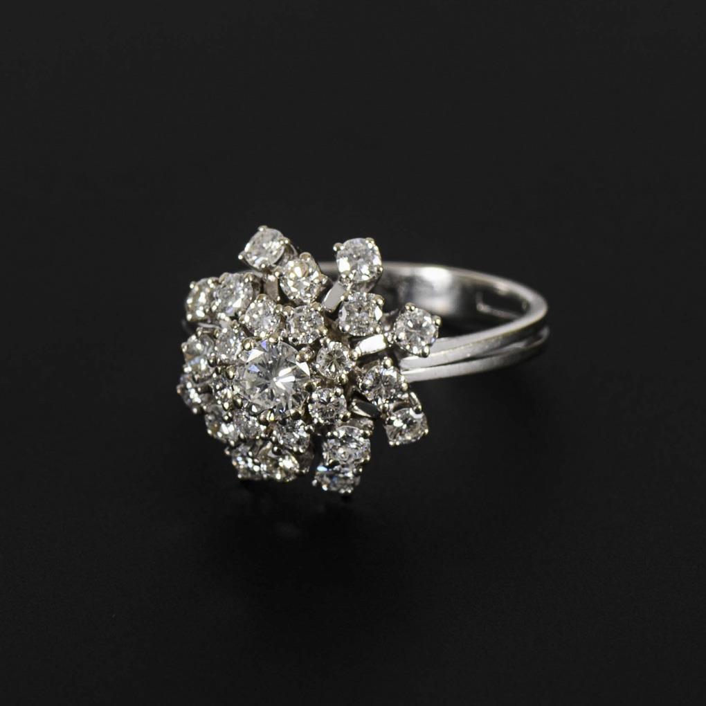 Raised chaton-set center stone, step-set surrounded by 24 more brilliant-cut diamonds. 2-stepped rail.