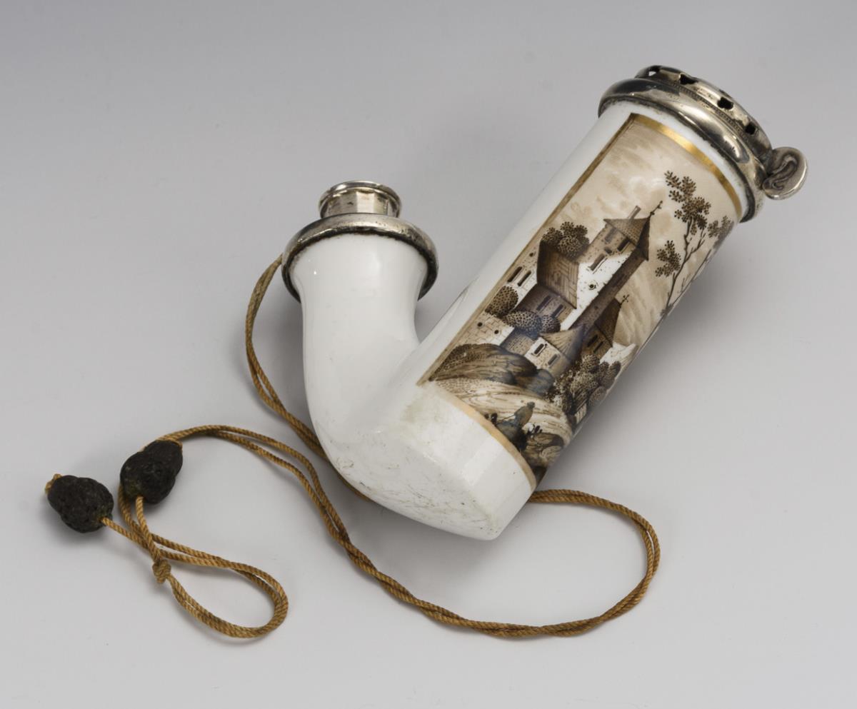 1x marked pommel swords Meissen: with metal-mounted lid, juice bag and the view of Herrnhut. / 1x with metal-mounted lid and the designated view of the guild hall in Gotha, verso a list of names. / 1x with silver-mounted lid and the sepia-painted view of a church in an alpine landscape. Partial minimal gold abrasion, 1x pipe attachment bumped.