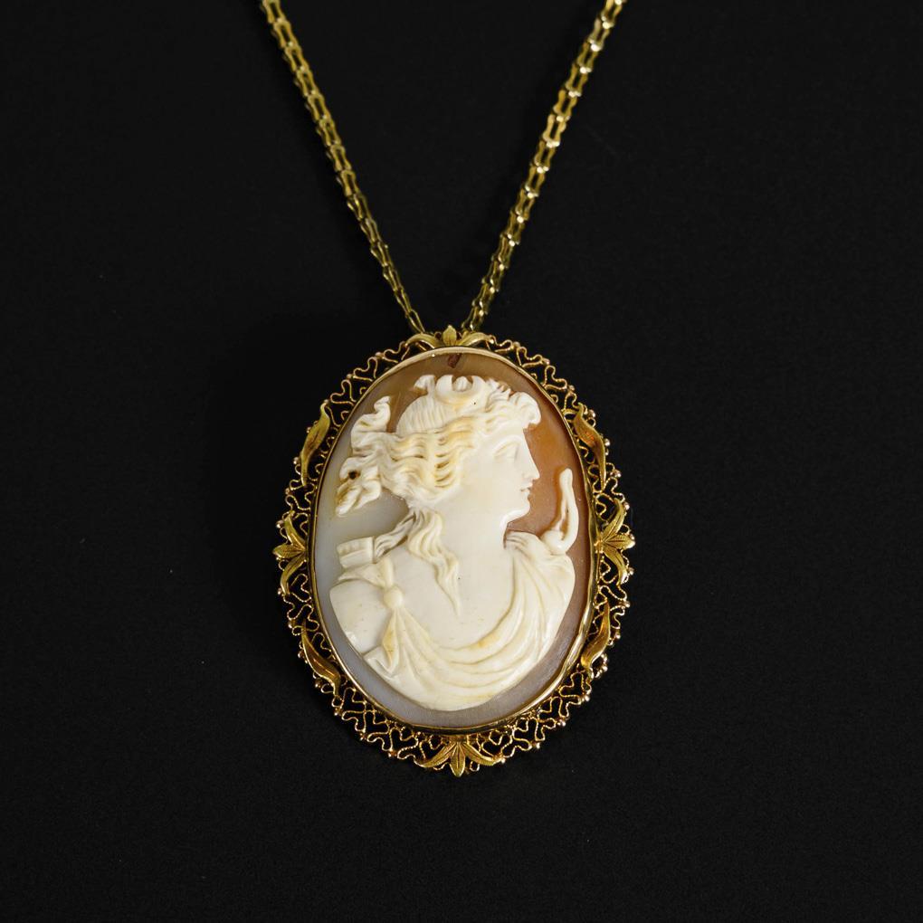 Pendant / brooch with shell cameo on chain, late 19th c.
