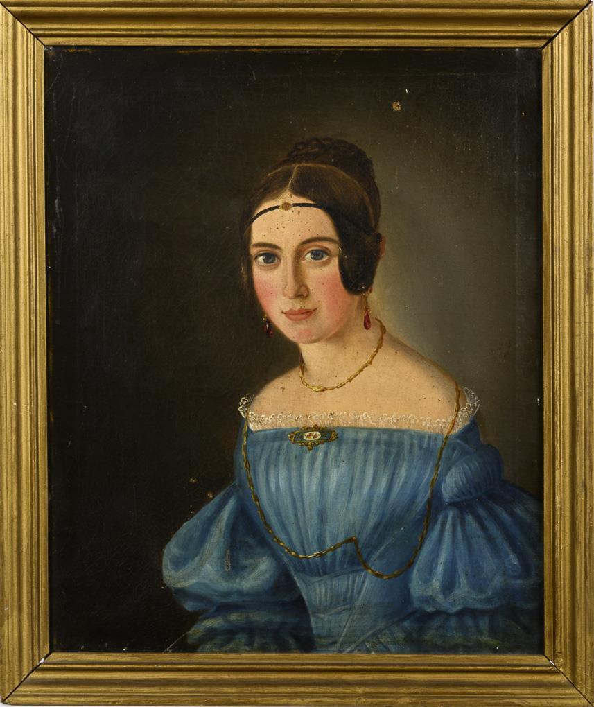 Portrait of a young woman in blue dress with gold jewelry. A defect.