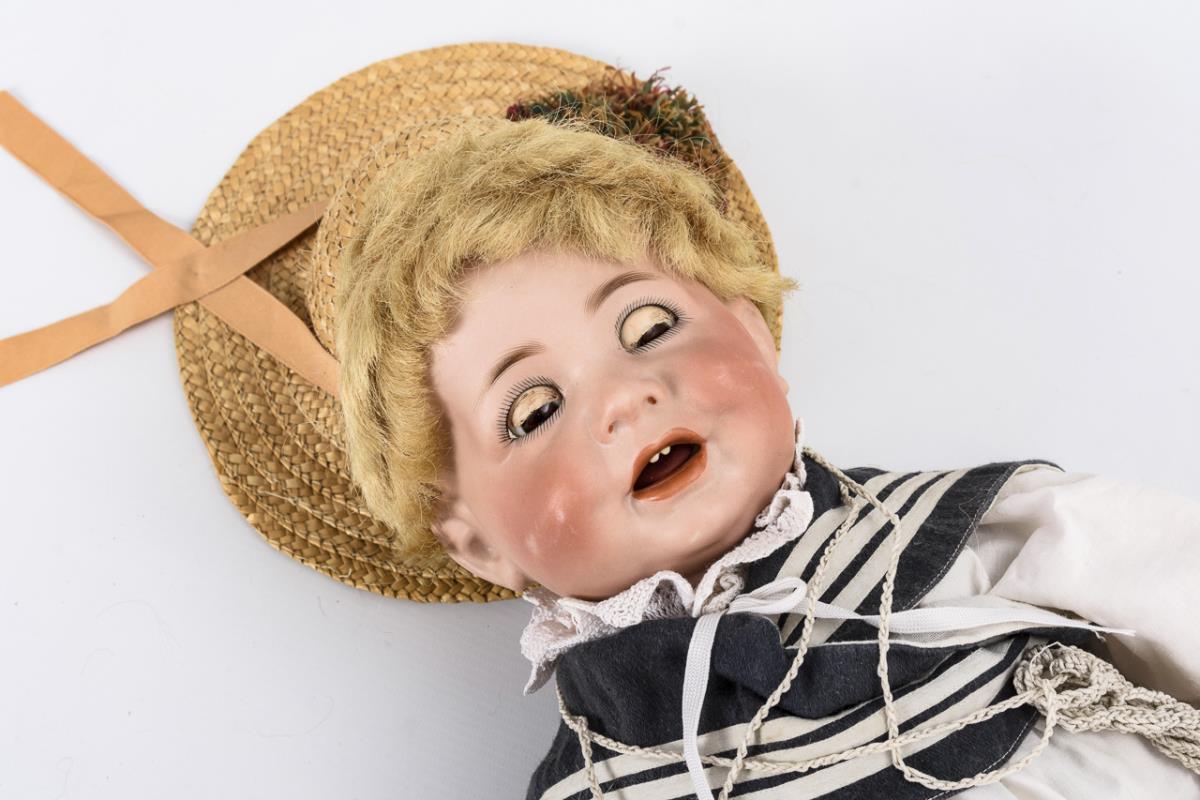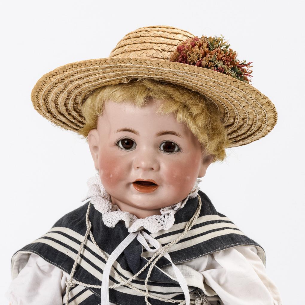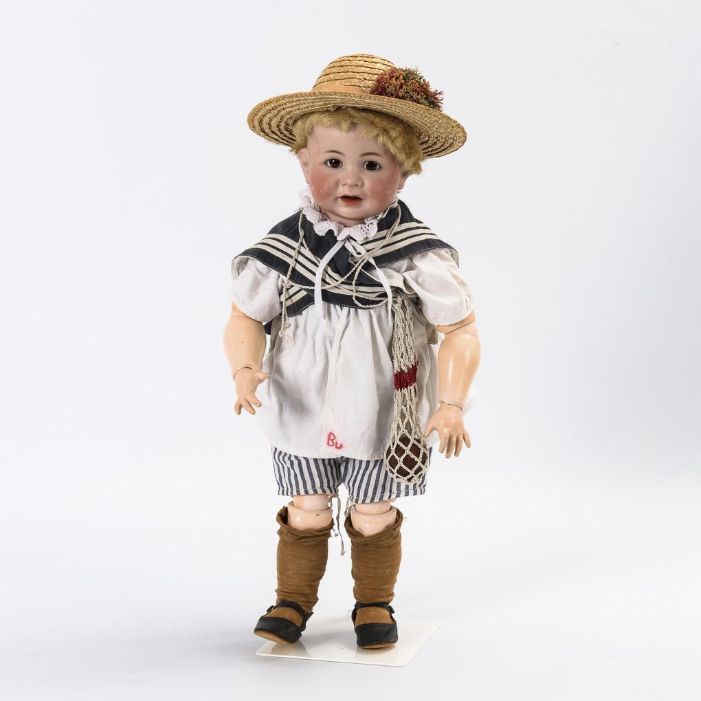 Crank head, brown sleeping eyes, movable tongue, synthetic hair wig. 15-piece toddler body. Sailor clothes, straw hat, black oilcloth shoes. In addition ball in net. Head x-rayed: without defects. Body partially rubbed, hands painted over.
