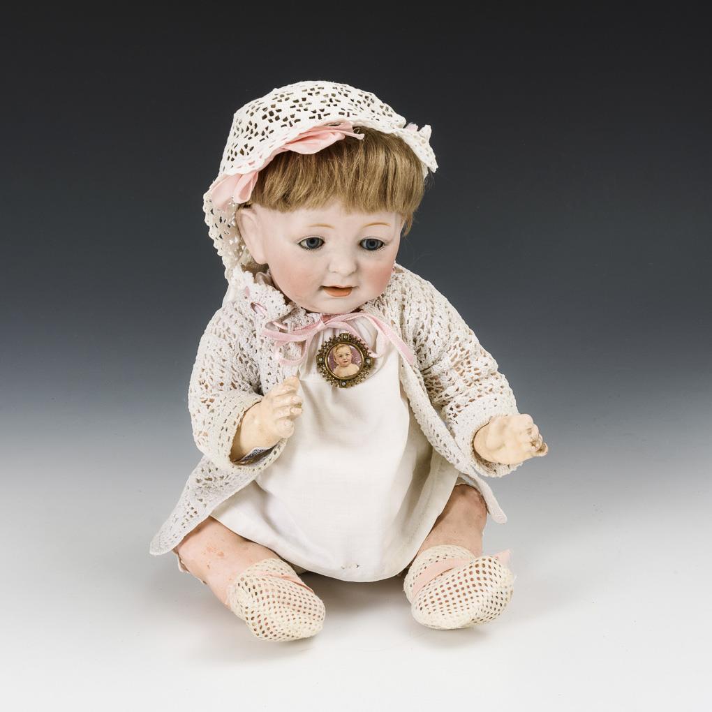 Crank head with tightly plastered lid, blue sleeping eyes, old blond mohair wig. 5-piece sitting baby body. White crochet clothing, little hat, brooch. Head without visible defects, arms supplemented (1x with cotter pin on the upper arm).