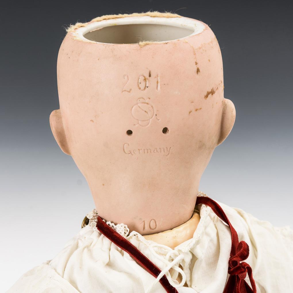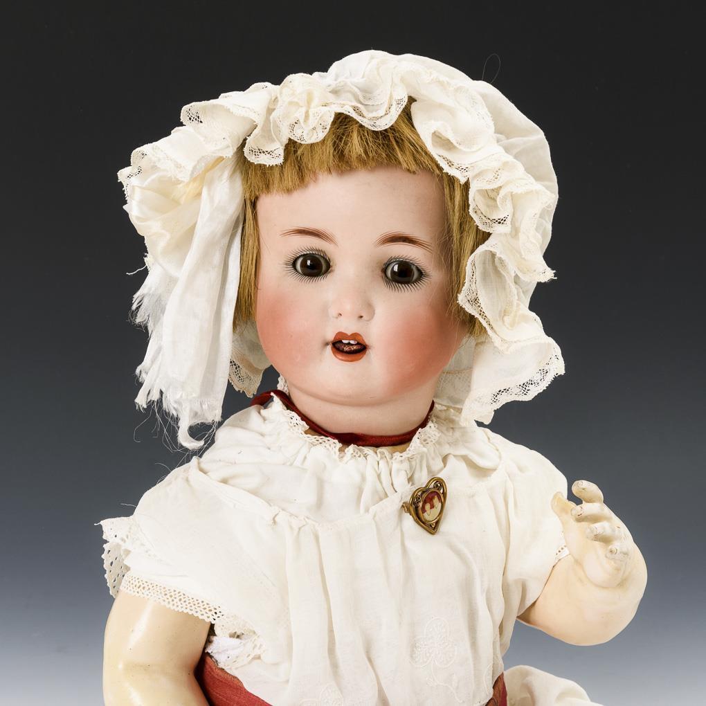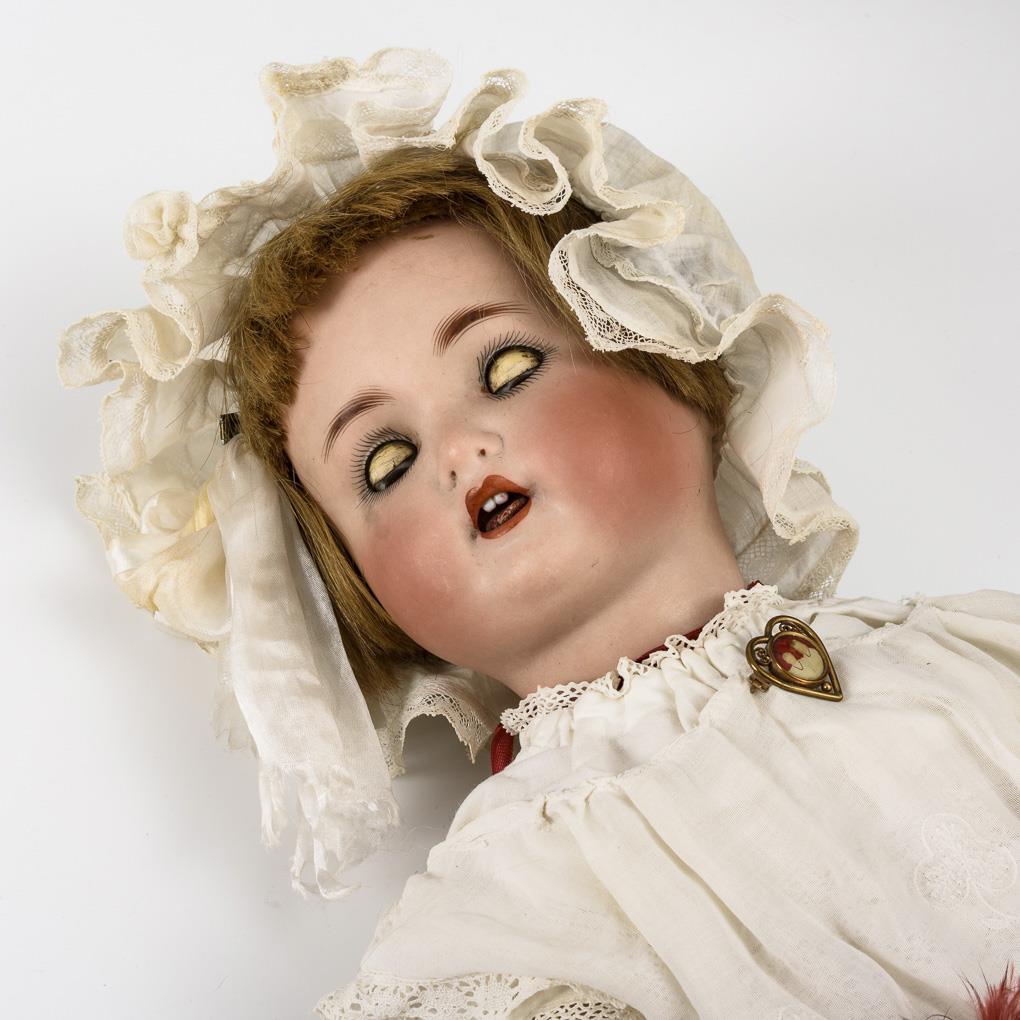 Crank head, brown sleeping eyes, moving tongue, blond human hair wig. 5-piece sitting baby body. White dress with red waist bow and doll head, red shoes, white bonnet. Head x-rayed: without defects. Played with, tongue and hands rubbed.
