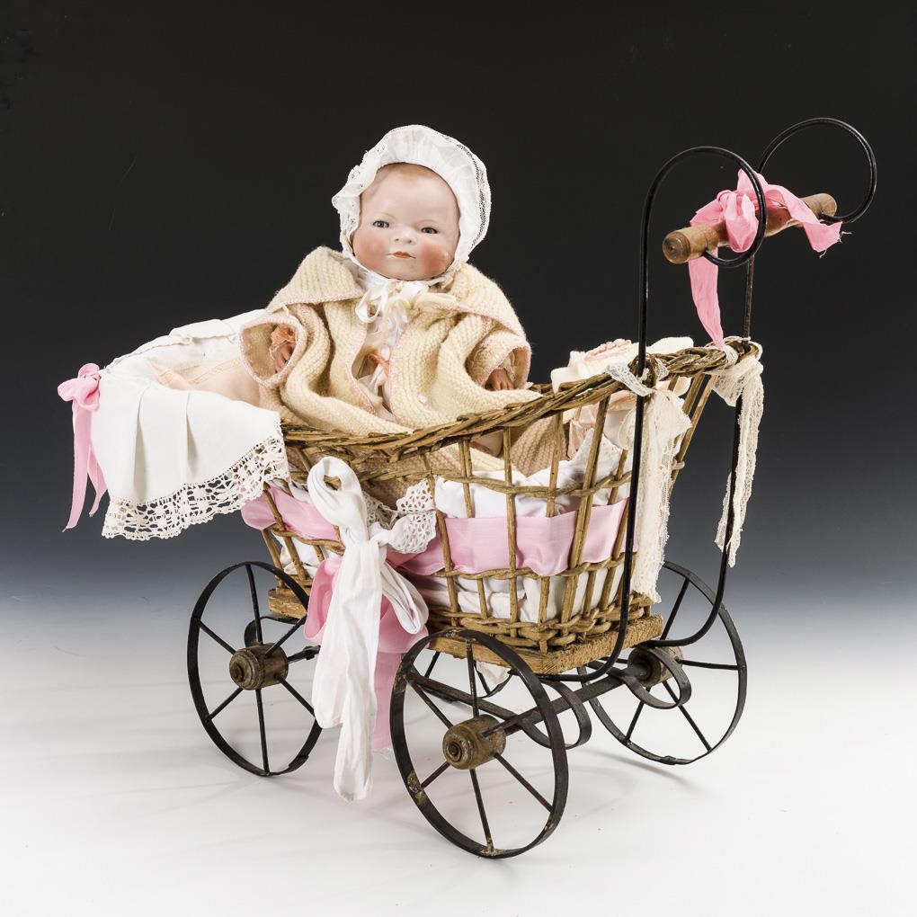 Binding head, blue sleeping eyes, brown tinted hair base. Sitting cloth body with faded stamp, silenced voice and celluloid hands. Light colored clothing, little cap, heart medallion pendant. Eyelids minimally rubbed. L 26 cm. Comes with small woven wagon with iron wheels. With signs of age and repair. 53 x 63 x 28 cm.