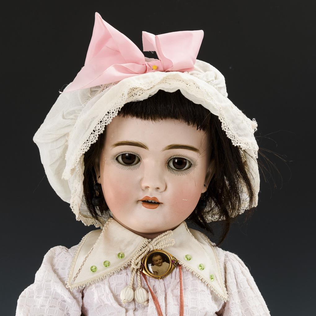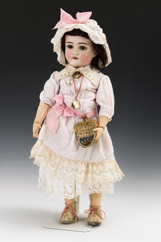 Crank head, brown sleeping eyes, earrings, brown human hair wig. 15-piece articulated body. White dress, bonnet with pink bows, beautiful old baby brooch, pearl bag. Head x-rayed: without defects. 1 finger left repaired.