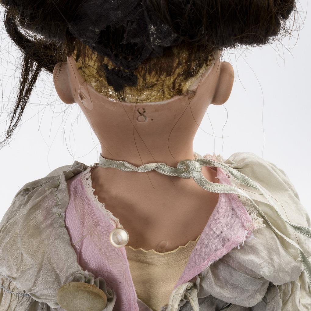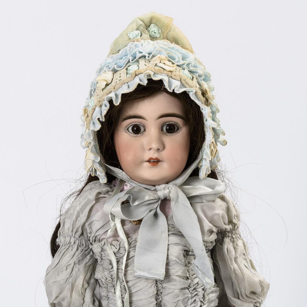 Head with tightly plastered lid, fixed brown glass eyes, long black human hair wig. Leather body with bisque forearms. Light blue dress with beaded belt, art nouveau pendant, bonnet and old black oilcloth shoes. Head not x-rayed, but no defects visible. Right foot with repair.