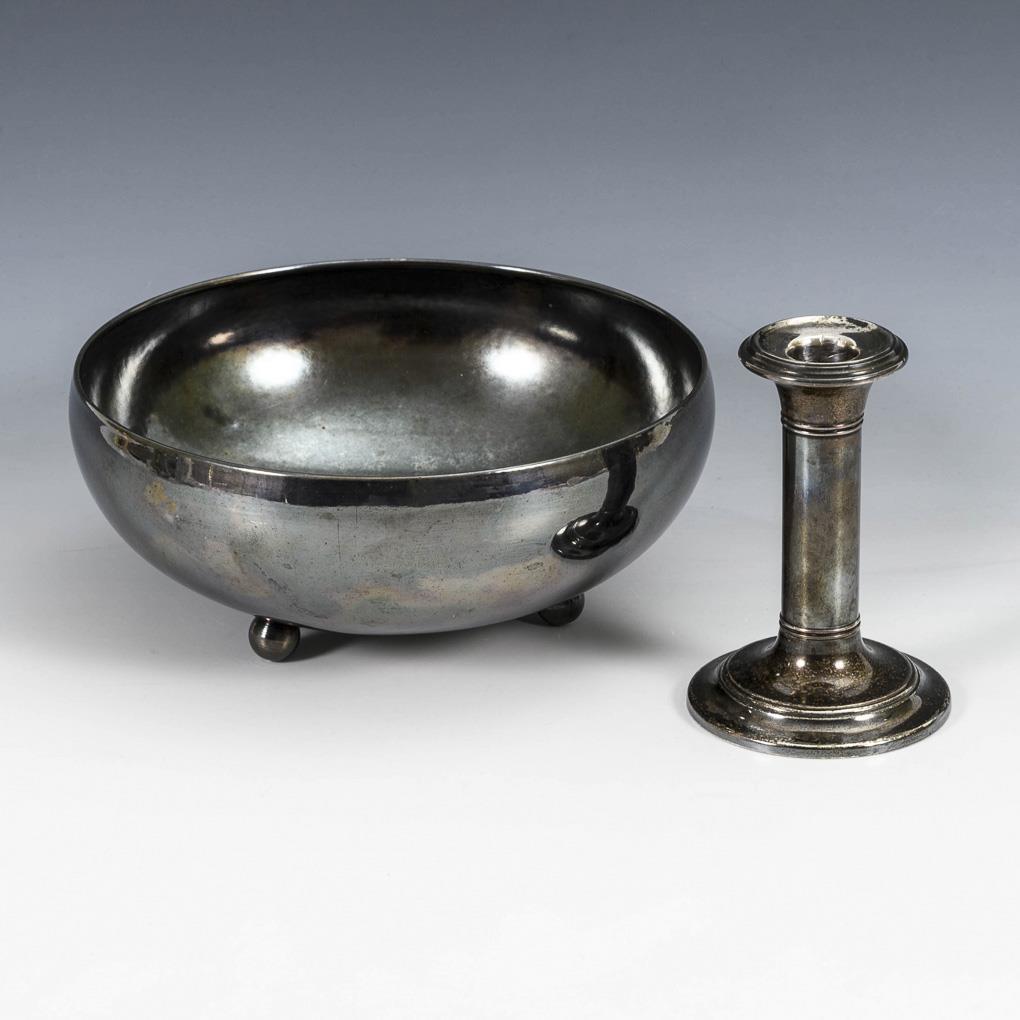 Simple 1-flame candlestick. H 11 cm. / Round art deco bowl. H 7,5 cm, Ø 18,5 cm. Blackened, small dents.