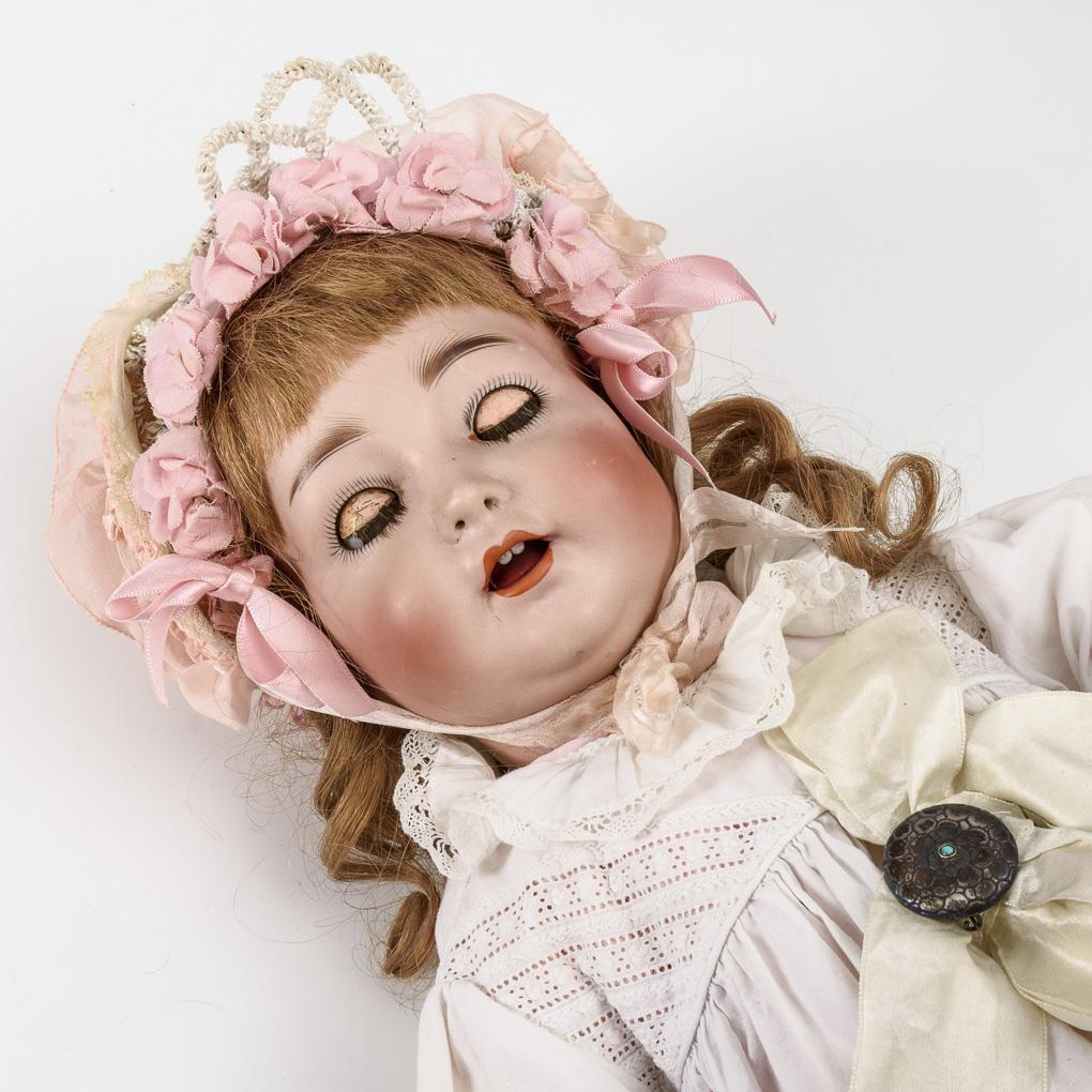 Crank head, blue sleeping eyes, eyelashes, open nostrils, flutter tongue, blond curly wig. 5-piece standing baby body. White dress, pink bonnet, white patent shoes. Tiny chip on the neck crank, head seam minimally brand cracked.