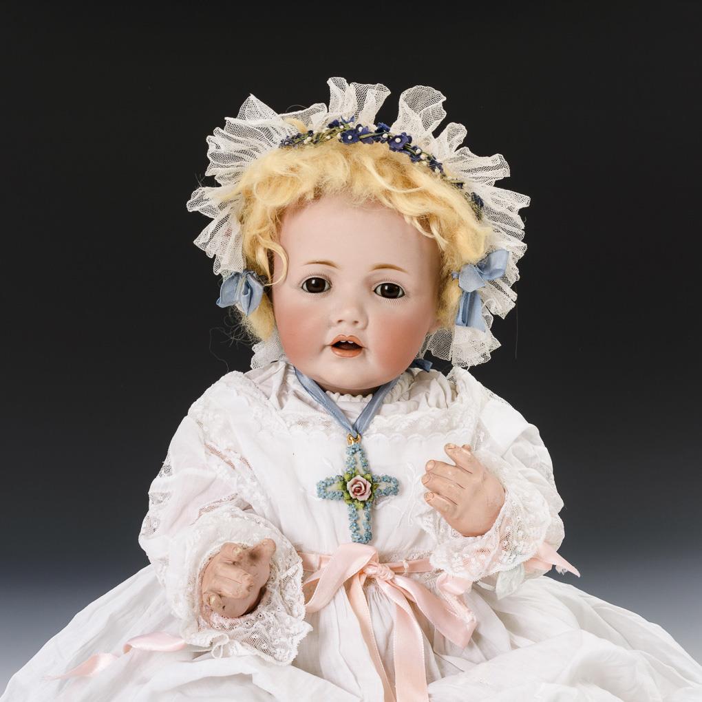 Crank head with tightly plastered lid, brown sleeping eyes, blond mohair wig. 5-piece sitting baby body. White christening gown with pink ribbons, beaded bonnet, porcelain cross pendant. Head not x-rayed: no defects visible. Left upper arm with repair spot.