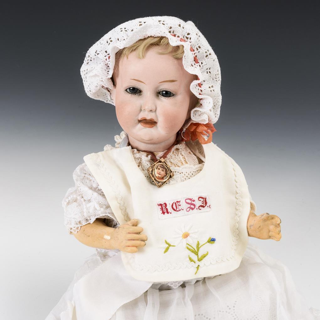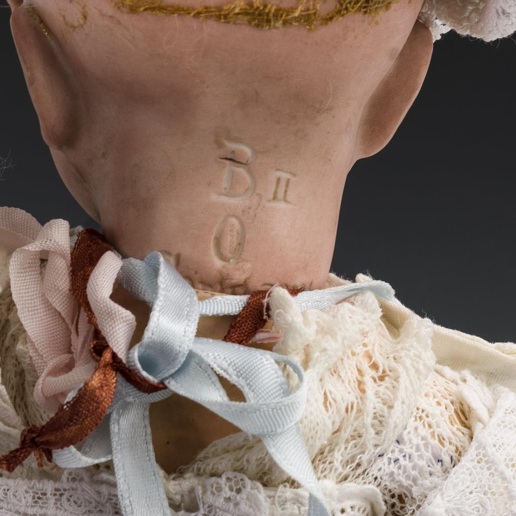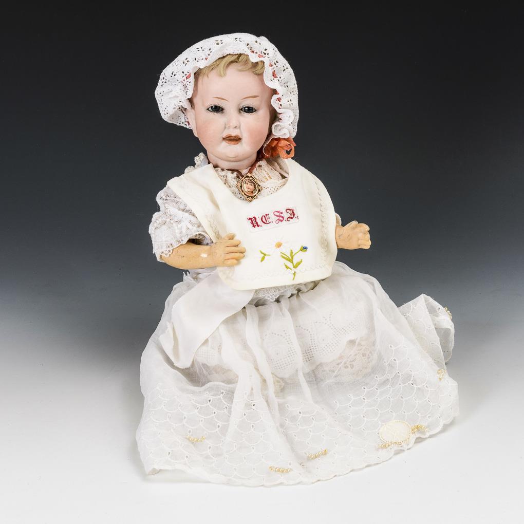 Crank head, blue sleep eyes, open/closed mouth, old blond mohair wig. 5-piece sitting baby body. White dress, bib, bonnet. Head x-rayed: without defects, only small burn crack in the head mark. Hands and feet probably minimally revised.