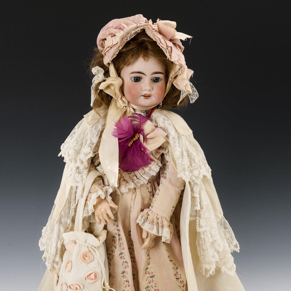 Crank head, fixed blue glass eyes, brown mohair wig. 11-piece jointed body. Bright dress with pink stripes and flowers, white cape, pink hood, pompadour bag, white baby shoes. Head x-rayed: without defects.