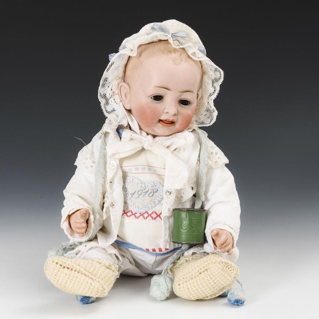 Crank head, brown sleeping eyes, open/closed mouth, dashed baby hair. 5-piece sitting baby body. White clothes, bonnet and crochet shoes. In addition, old child rattle. Head without visible defects, only barely visible burn cracks behind the ears.