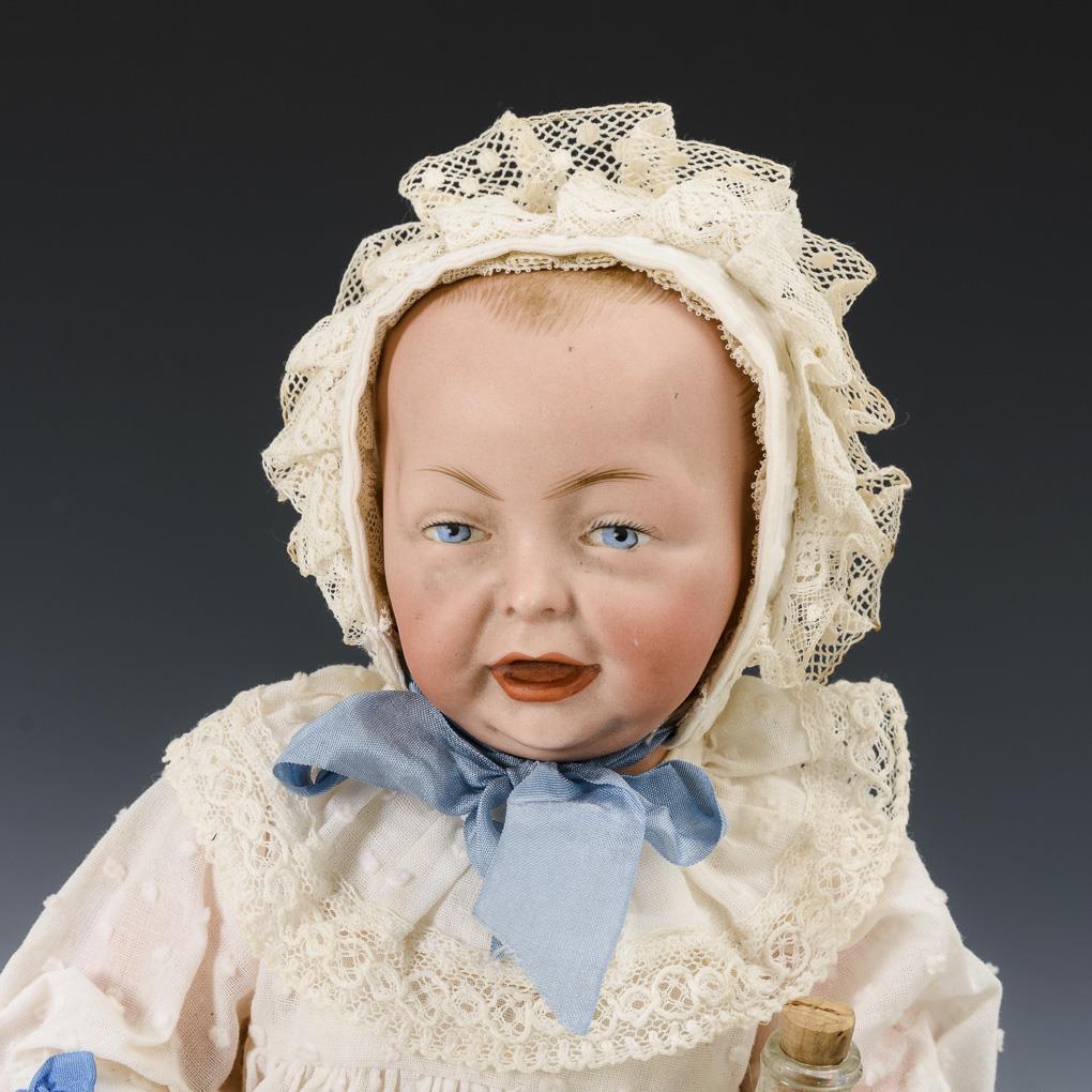 Crank head, painted blue eyes, open mouth, dotted baby hair. 5-piece sitting baby body. White dress and matching hood. Plus rattle, bottle and old Steiff kitten. Head without visible defects, body with minimal paint wear.