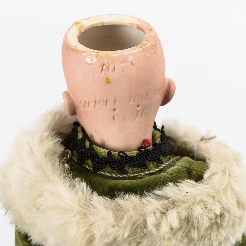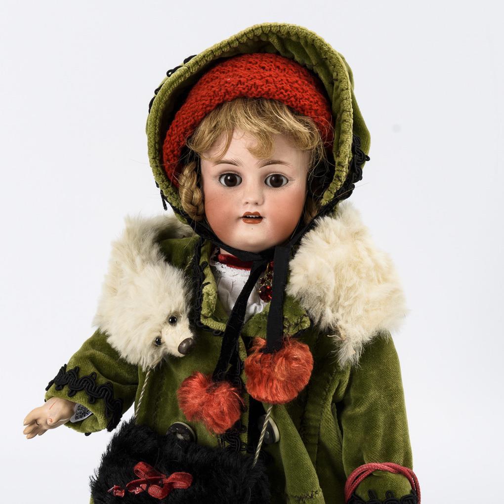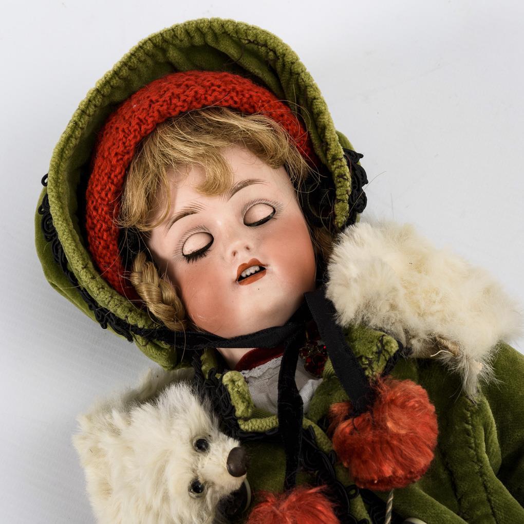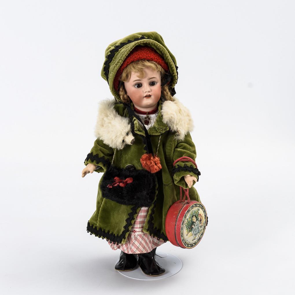 Crank head, brown sleeping eyes, blond human hair wig. Very nice 15-piece limb body. Green velvet coat, matching hood, white fur scarf, old muff, black boots and red tin can as a bag. Head x-rayed: without defects. 1 finger glued right.