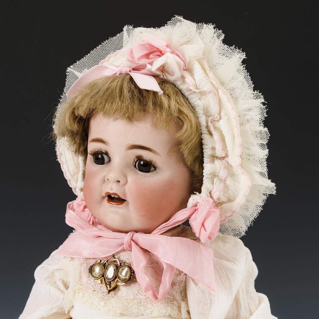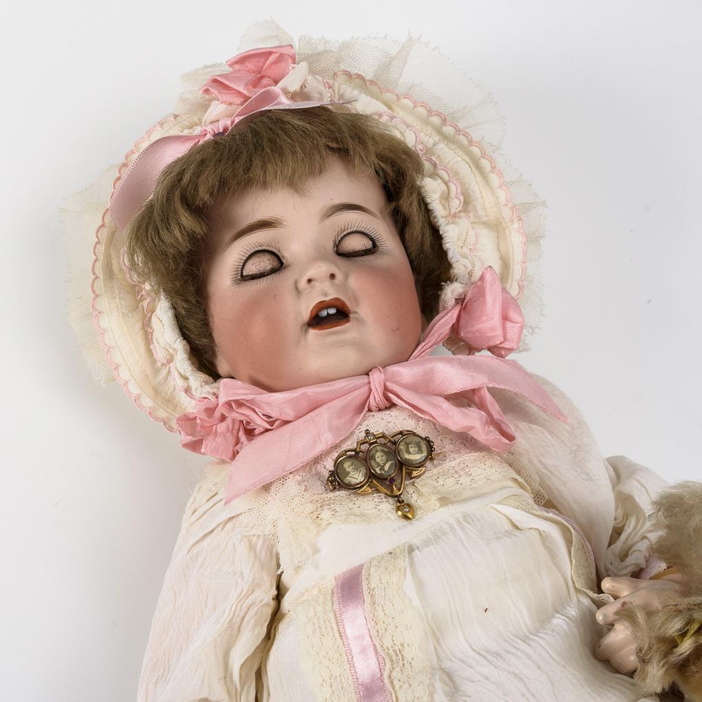 Crank head, brown sleeping eyes, eyelashes, blond mohair wig. Simple 5-piece cardboard body with silenced voice. White dress with pink bows, art nouveau brooch, matching hood. In addition Steiff squirrel. Head x-rayed: without defects. Body painted over.