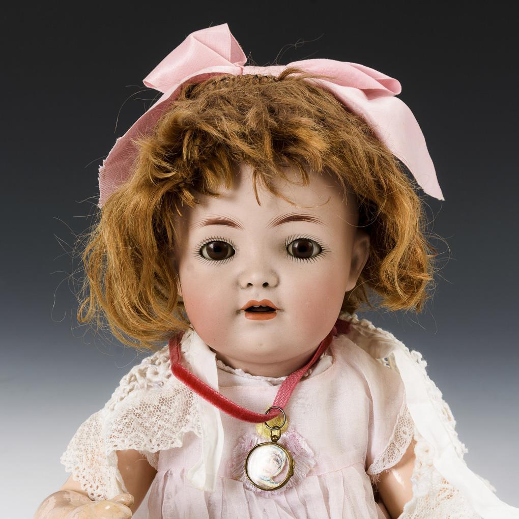 Crank head, brown sleeping eyes, open nostrils, reddish brown mohair wig. 5-piece sitting baby body. White dress, green leather shoes, pink hair bow. Head x-rayed: without defects. Hands and feet with repair spots.