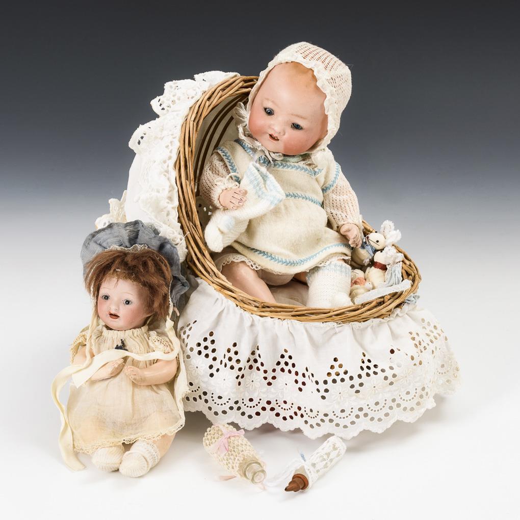 Babies each with crank head, glass eyes and 5-piece sitting baby body. L 18/24 cm. Plus bassinet (H 22 cm), 2 glass bottles and 3 small bunnies. Heads without visible defects, 1x with bumps on fingers and toes.