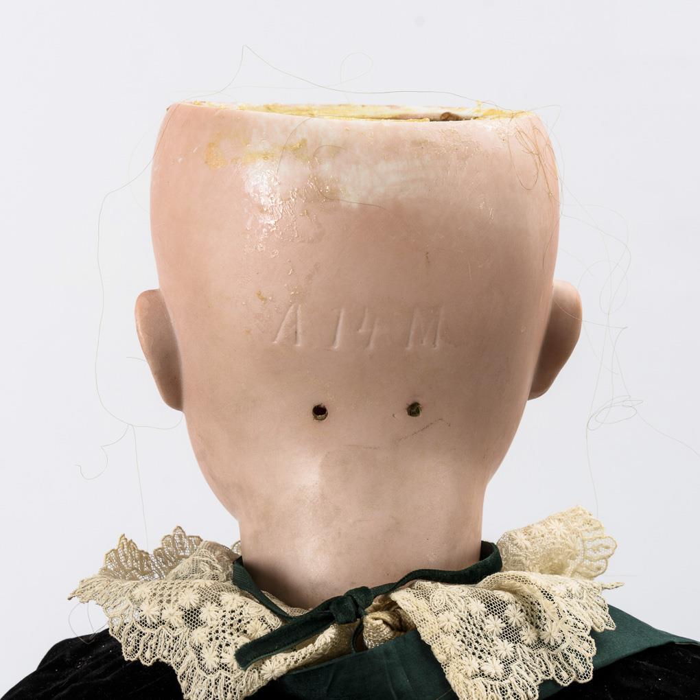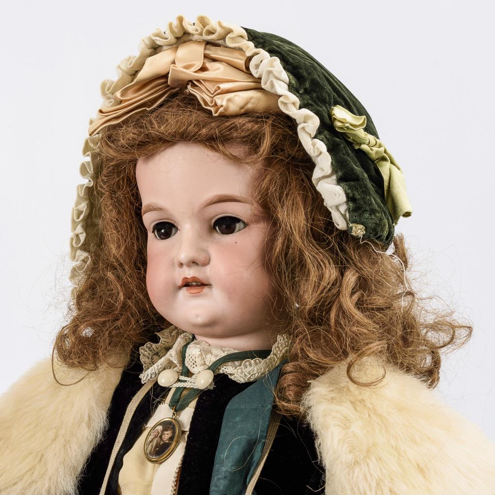 Crank head, brown sleeping eyes, eyelashes, brown synthetic hair wig. 15-piece articulated body. White dress, black velvet jacket, green velvet hood, fur stole, old children's shoes and beautiful old fur muff with papier-mâché cat head. Crank head with 2 short hairline cracks on the crown of the head and neck. Body partially painted over.