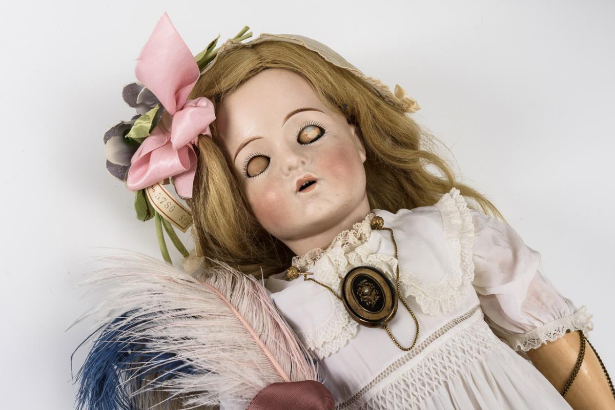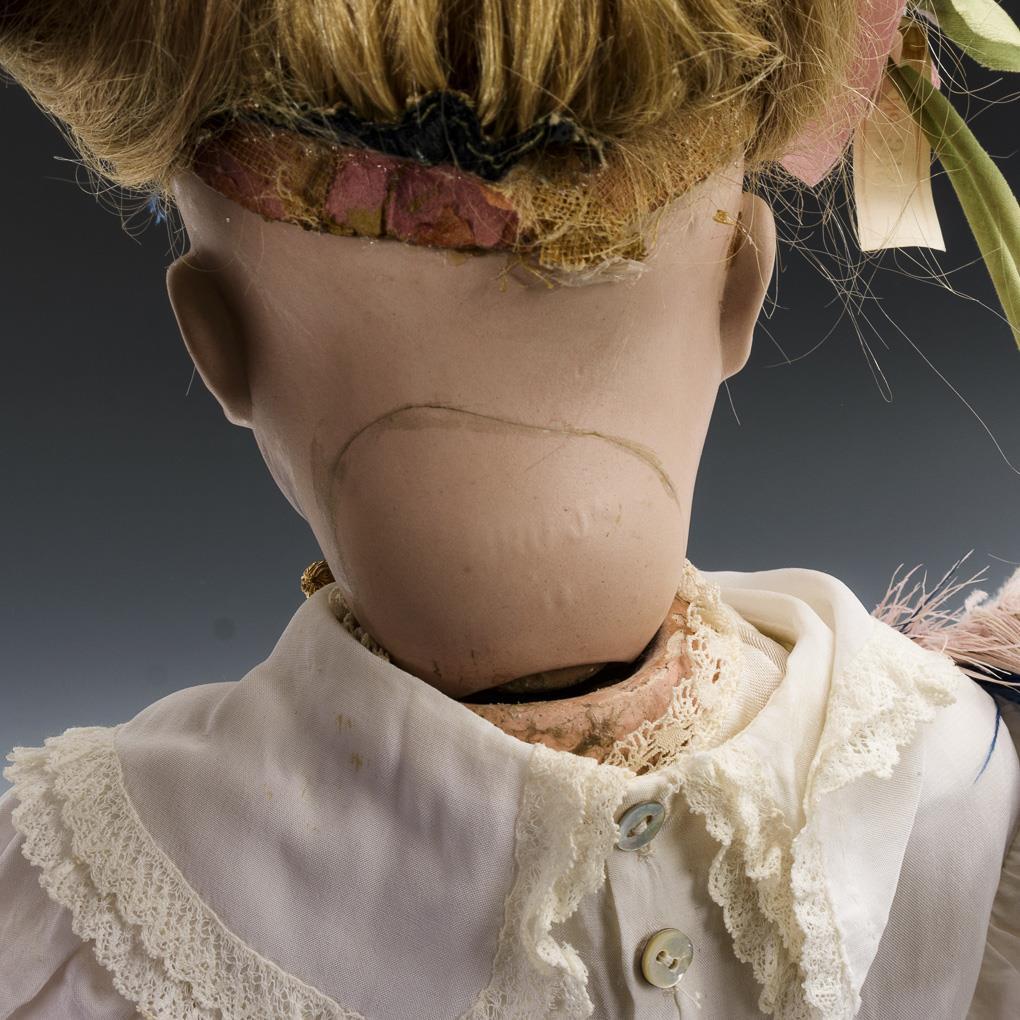 Pale crank head, blue sleeping eyes, blonde human hair wig.15-piece, French-German link body. White dress, light bonnet, green leather shoes, black pompadour bag, colored feather bush. Head with glued breakout at the back of the head. Body with color defects.