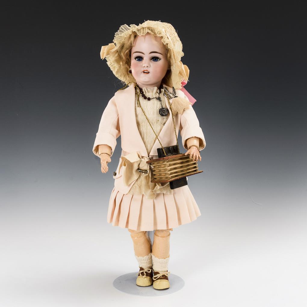 Crank head, blue sleeping eyes, eyelashes, earrings, blond mohair wig. 11-piece articulated body. Pale pink costume dress, old brown and white shoes, jewelry, hood and accordion. Head x-rayed: without defects, only some wig-pull at the back of the head.