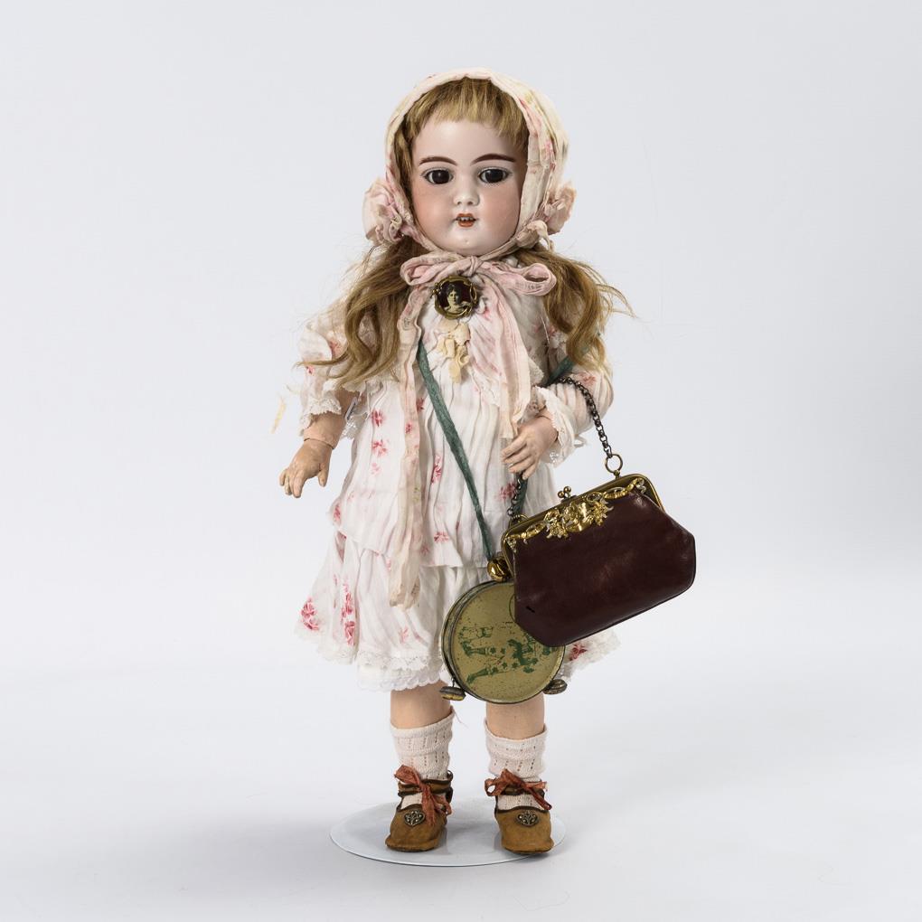 Crank head, brown sleeping eyes, sculpted eyebrows, earrings, blond human hair wig. 15-piece articulated body. Bright little dress, matching hood, brown leather shoes, plus bag and tin drum. Head x-rayed: only 1 wig pull chip at the crown. 1 finger of the right hand repaired.