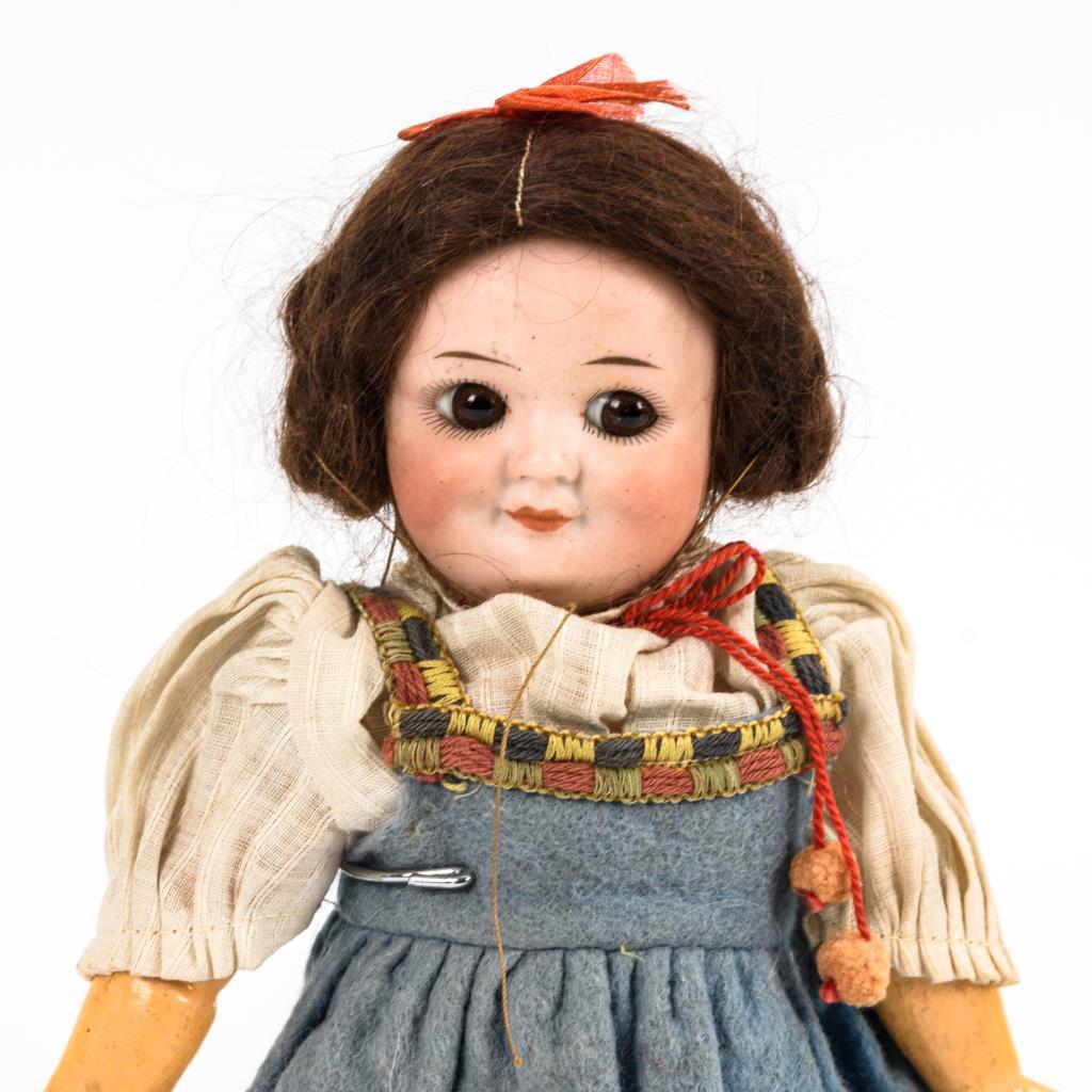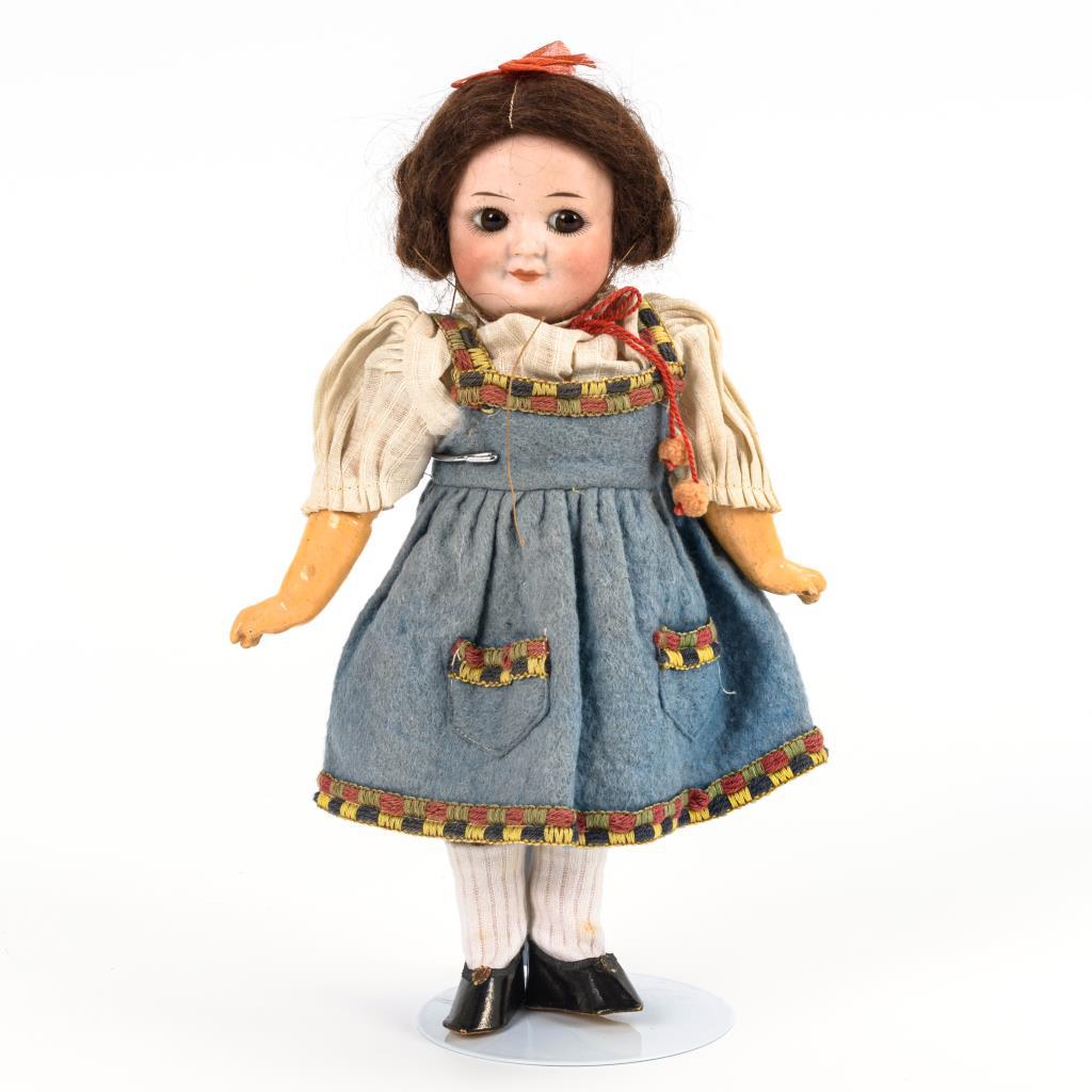 Kleine Schielpuppe mit braunen Augen, geschlossenem Mund und brauner Mohairperücke. 9-teiliger Gliederkörper. Blaues Trägerkleid aus Filz, mit bunten Borten. Kopf durchleuchtet, ohne Defekte.