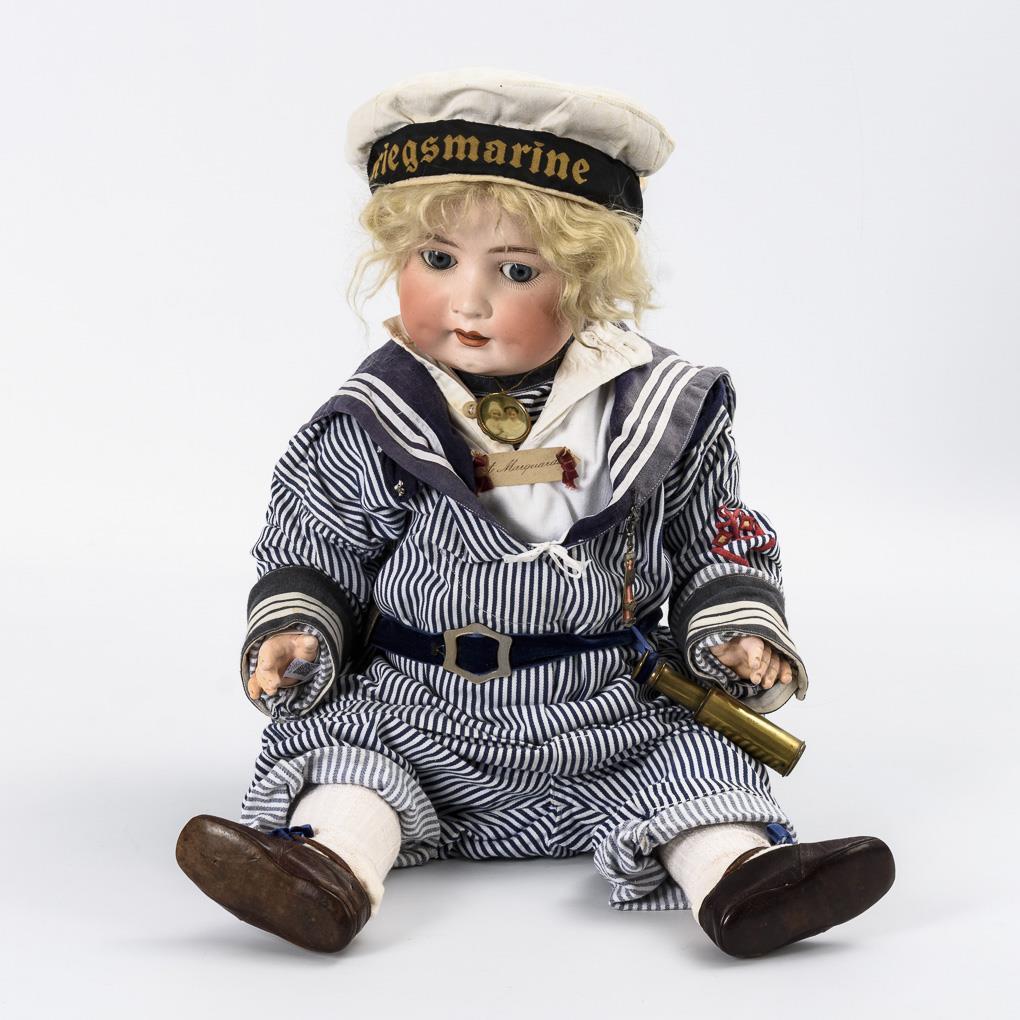 Crank head, fixed plastered blue eyes, movable tongue, blond mohair wig. 5-piece standing baby body. Dressed in old children's sailor suit and cap "Kriegsmarine" in addition small brass telescope. Head x-rayed: without defects, only minimal wig pull on the left temple.