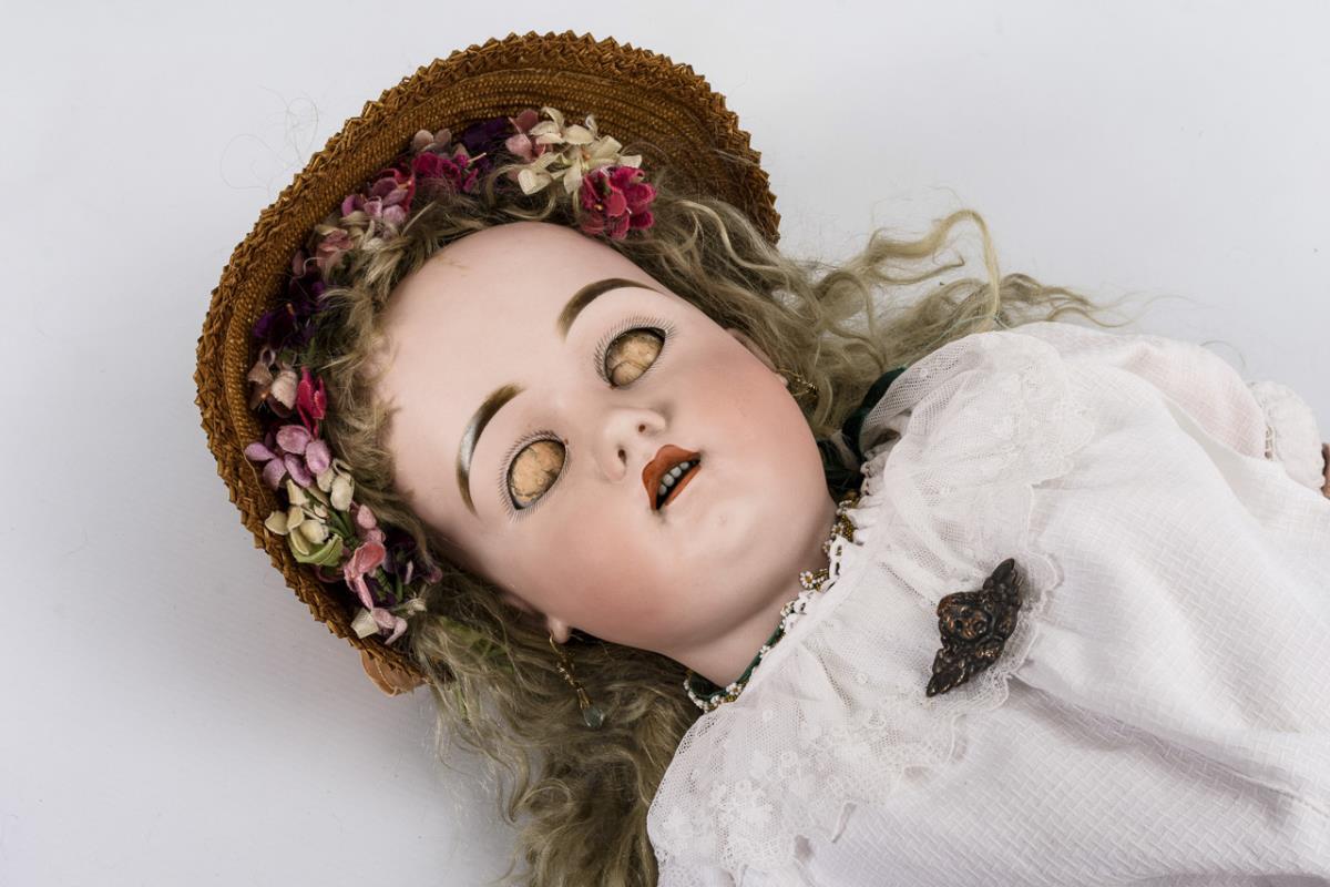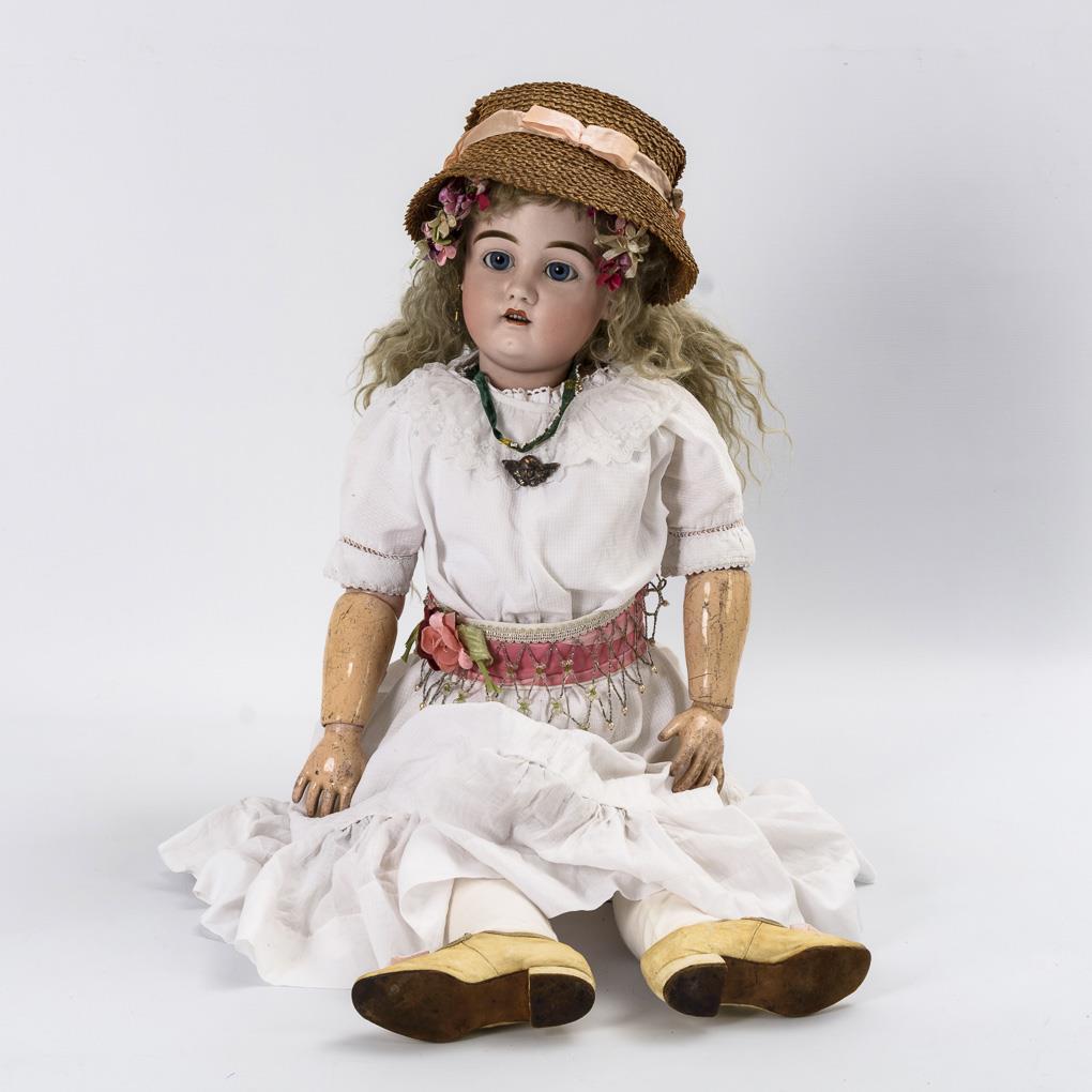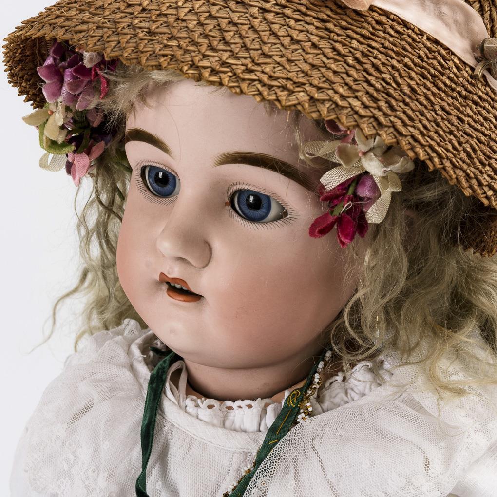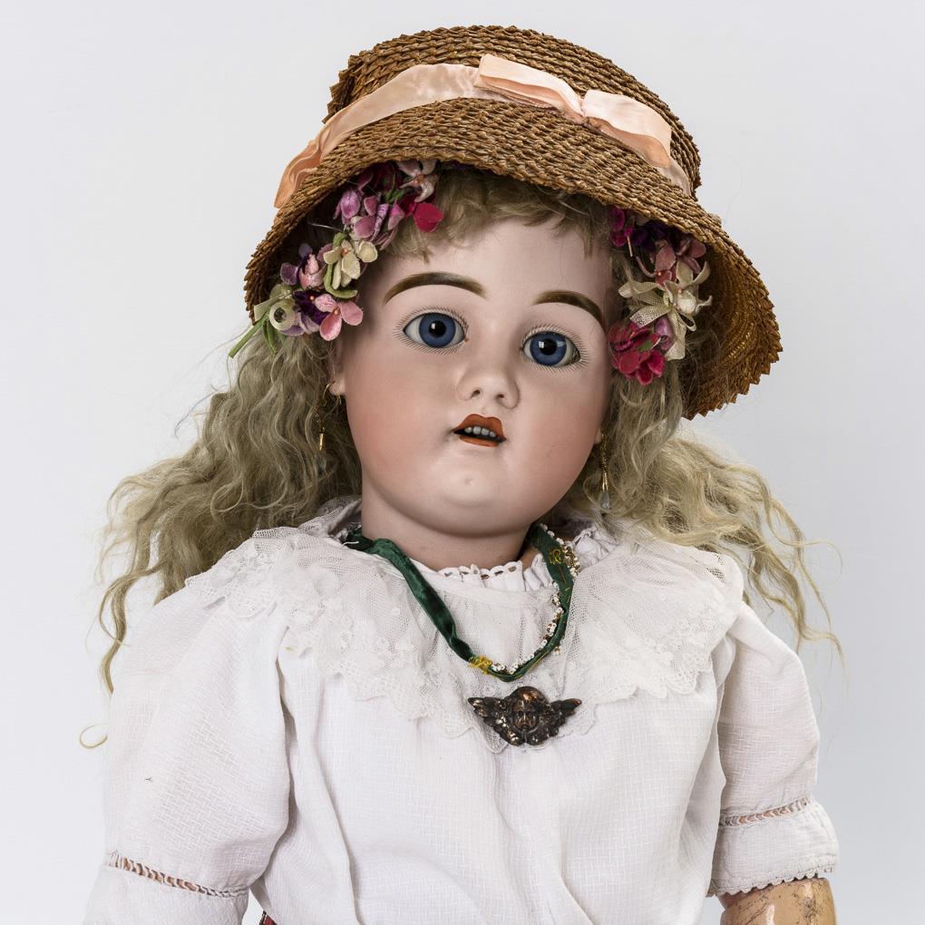 Crank head, blue sleeping eyes, earrings, blond mohair wig. 17-piece articulated body. Long white dress, barge hat, old children's shoes. Head x-rayed: without defects, only tiny burn cracks on the ears and minimal wig pull.