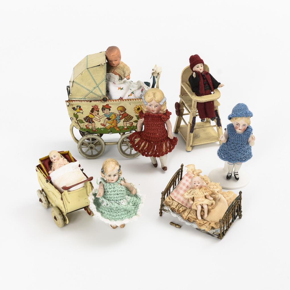 Convolute 7 dolls, 2 tin doll carriage, bed and high chair. For the dollhouse.