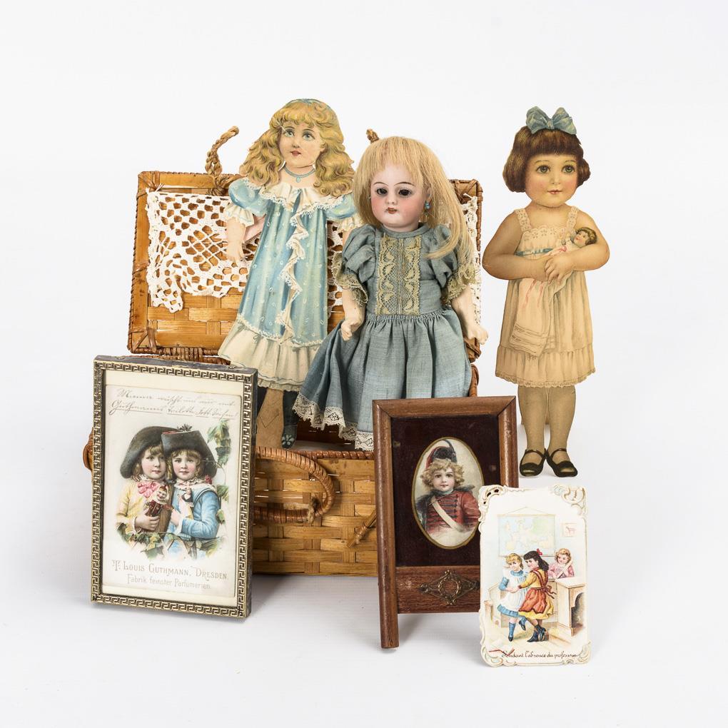 Blonde dollhouse girl (Simon & Halbig 1079) with crank head, sleeping eyes, blond real hair wig and mass body. Light blue dress, modeled shoes and stockings. L 19 cm. / 2 colored lithographed cardboard figures. L 22,5/23,5 cm. / 2 picture frames with colored lithographed depictions of children. H each 14 cm. Marks of age.