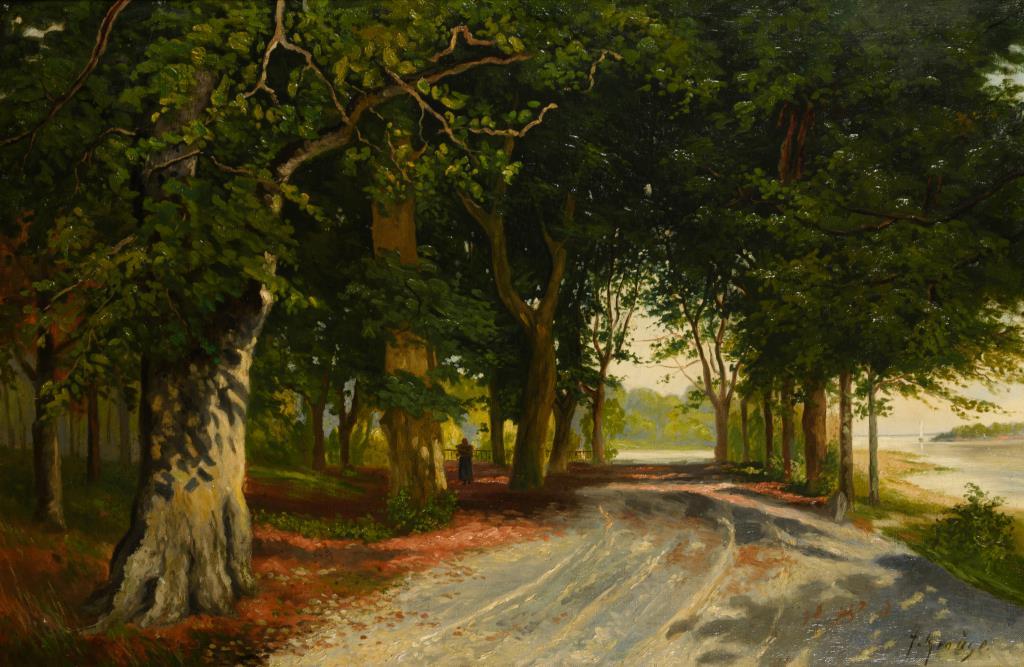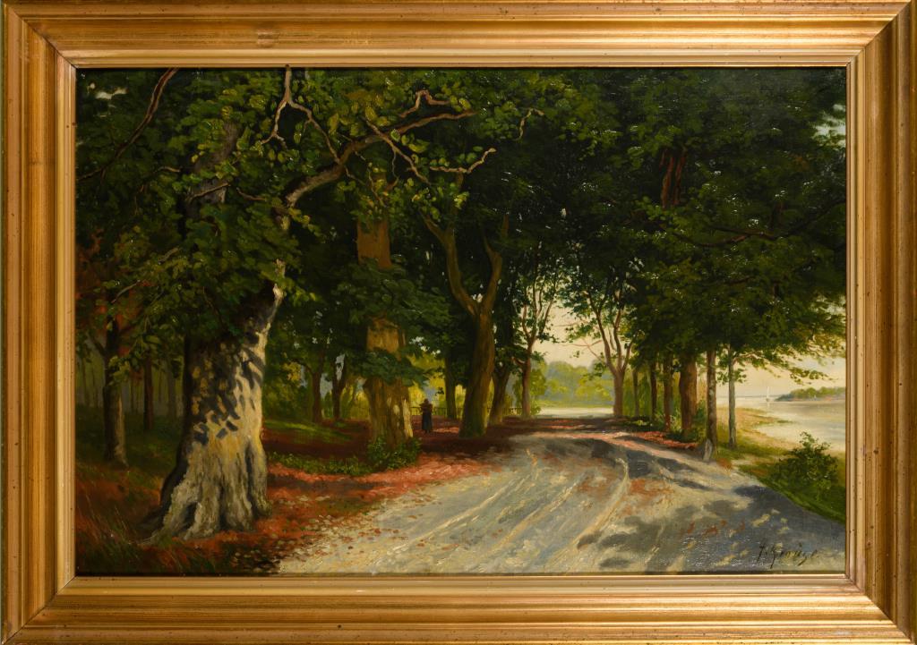 Staffagefigur im Schatten der Bäume nahe des Flussufers. Minimale Altersspuren.