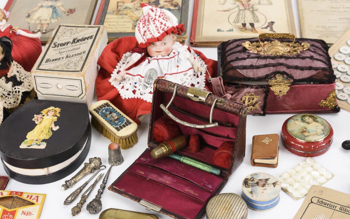 2x "Puppenmütterchens-Nähschule", 1x "Die fleissige Puppenschneiderin" and 1x "Schnittmuster zu Puppenmütterchens Nähschule". In addition, 4 pincushions with doll heads, 3 boxes, 2 picture frames and numerous beautiful sewing accessories for children and dolls. Signs of age and wear, some with small defects.