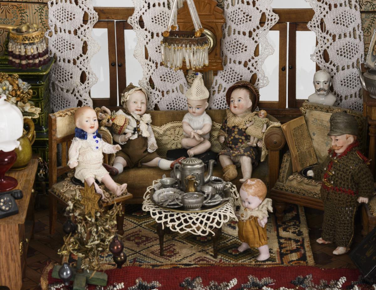 2-room case with 3 front columns, 3 glazed windows, curtains and 1 movable intermediate door. Furnished with furniture, tiled stove, piano, 2 ceiling lamps, wall lamp, Christmas tree, 2 clocks etc. In addition, numerous dolls, pewter dishes, decorative objects etc. Altersspuren, partly small defects.