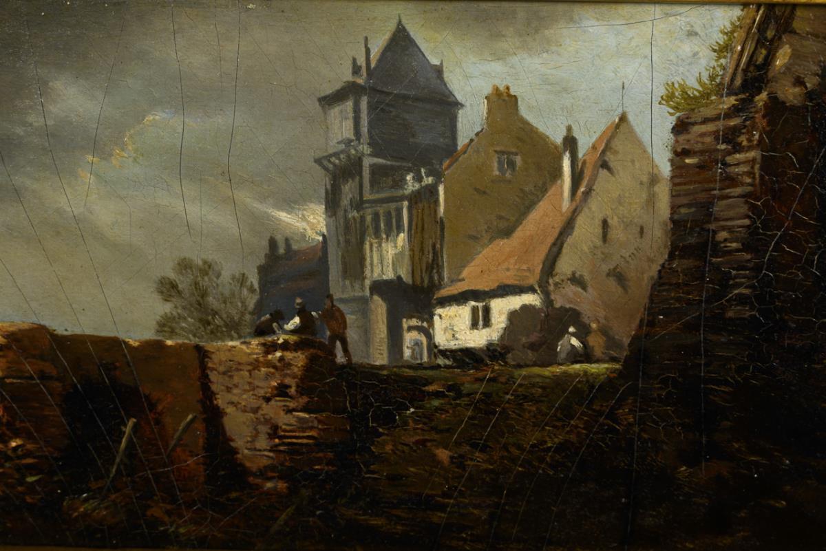 Staffage figures on bridge in the sunshine near the townhouses. Traces of age.