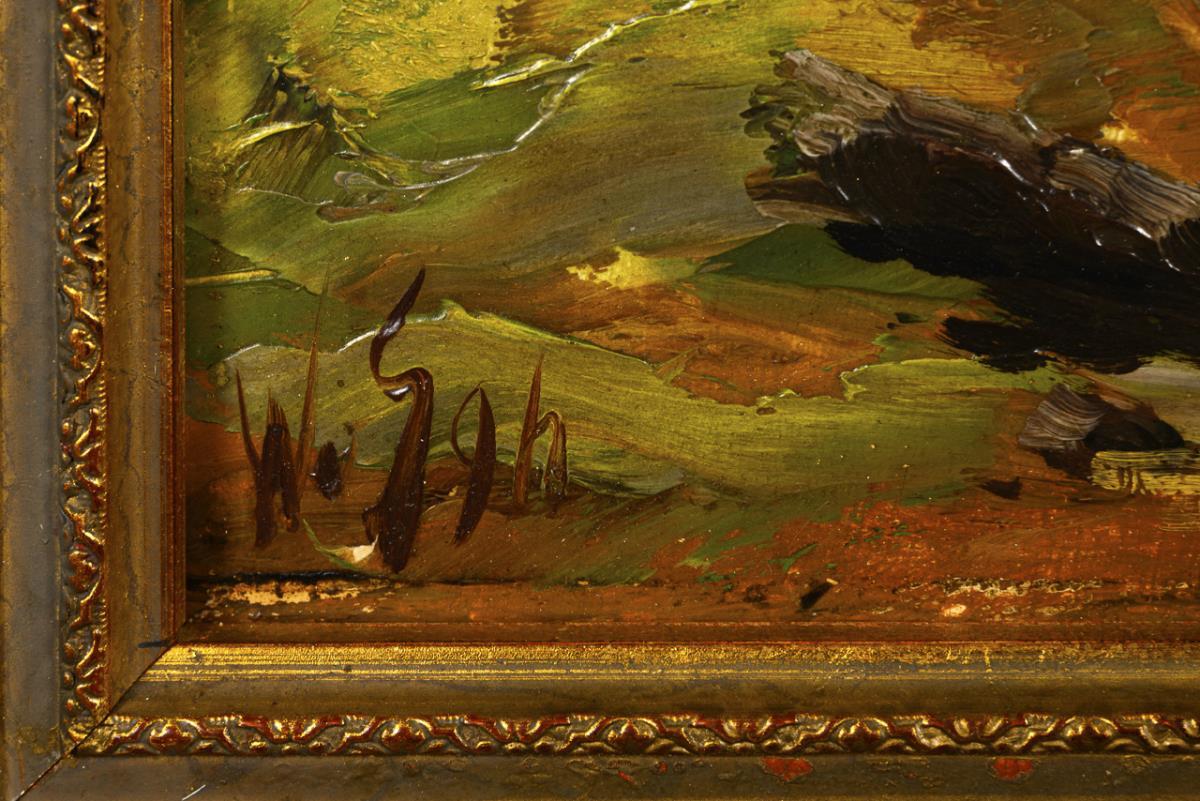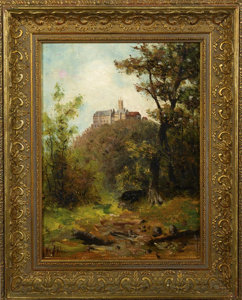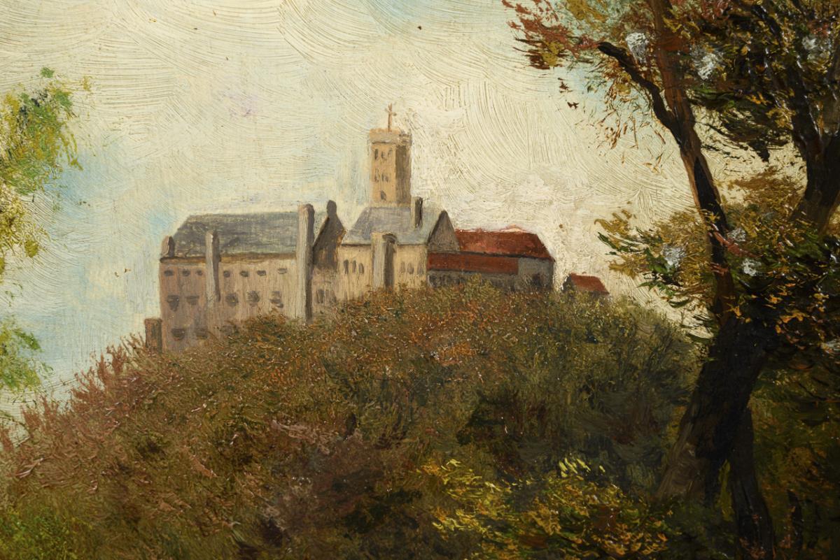 View to the castle above autumnal trees on a bright day. Slight signs of age.
