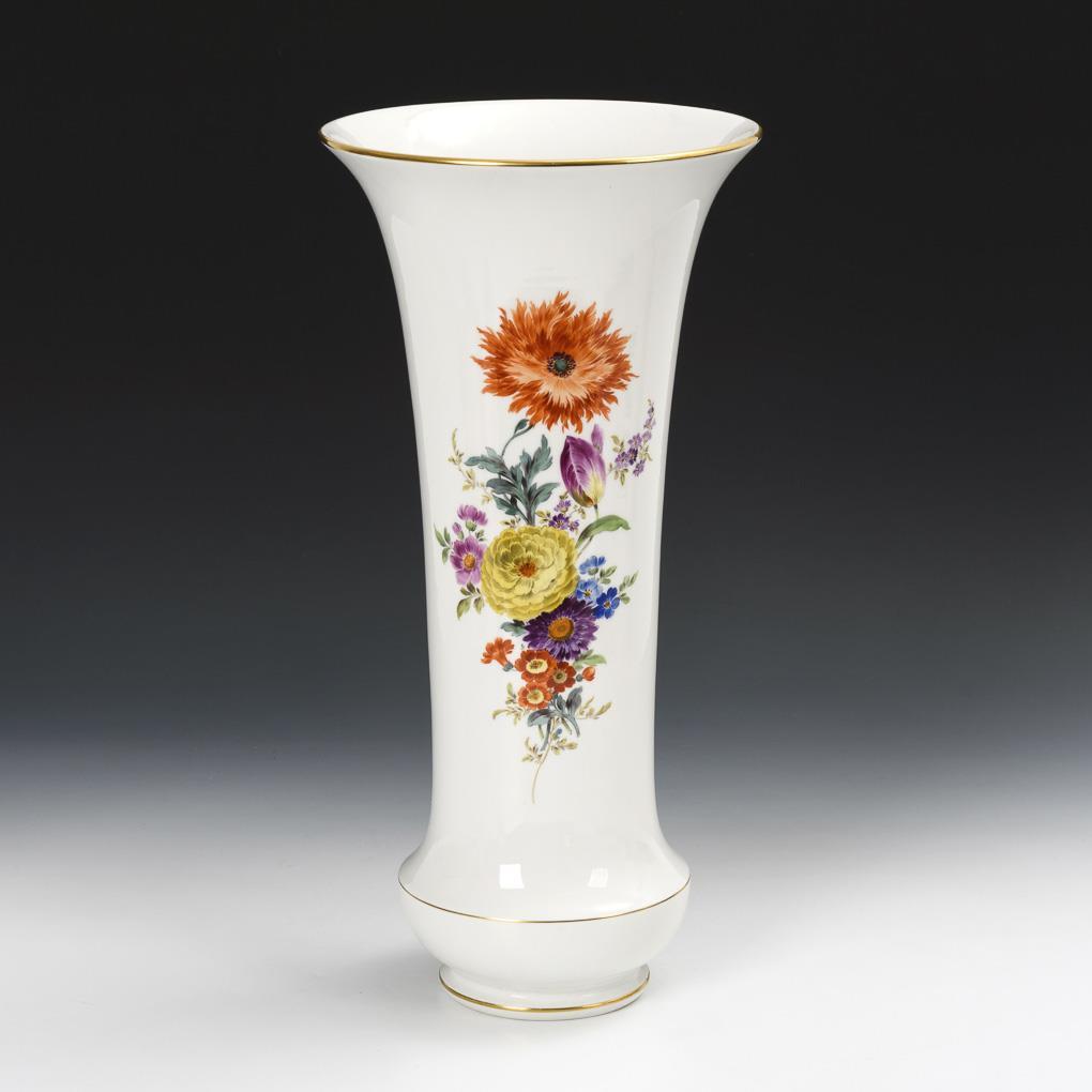 Crater vase with a large bouquet of flowers on the front with feather poppies, zinnia and tulip.