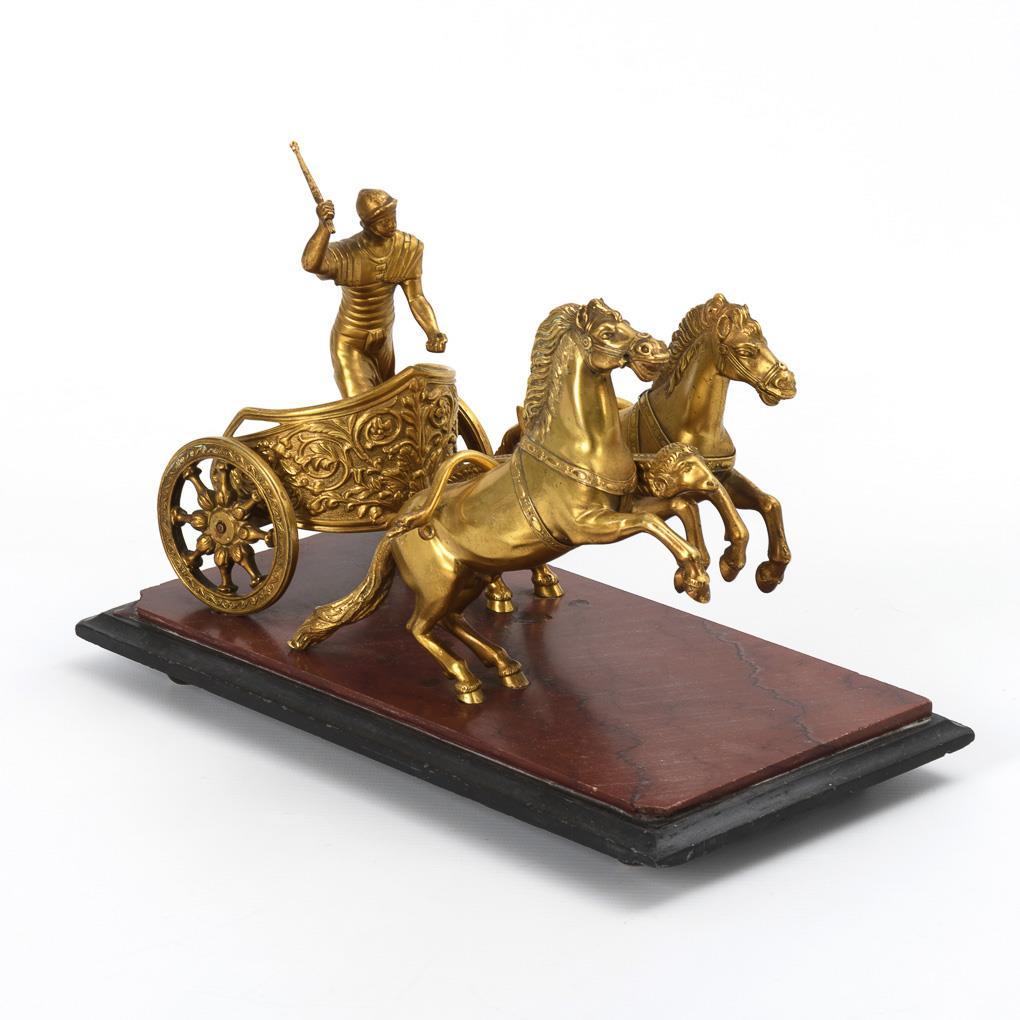 Finely executed casting of the magnificently relieved chariot (biga) with ram's head at the drawbar end. In the chariot standing leader who drives the two rising stallions. Slightly rubbed, reins and wheel nuts missing, chipping at the base.