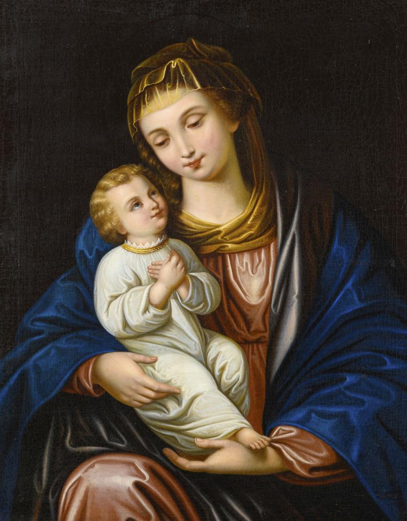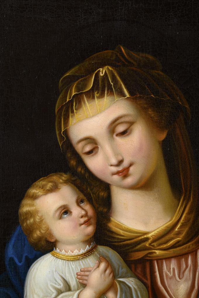 Lovingly holding the upward looking baby Jesus in her arms | Supplement 03.02.2023: Copy after Franz Russ the Elder (1817 - 1892) "Mary with Child". canvas wax-doubled, traces of age.