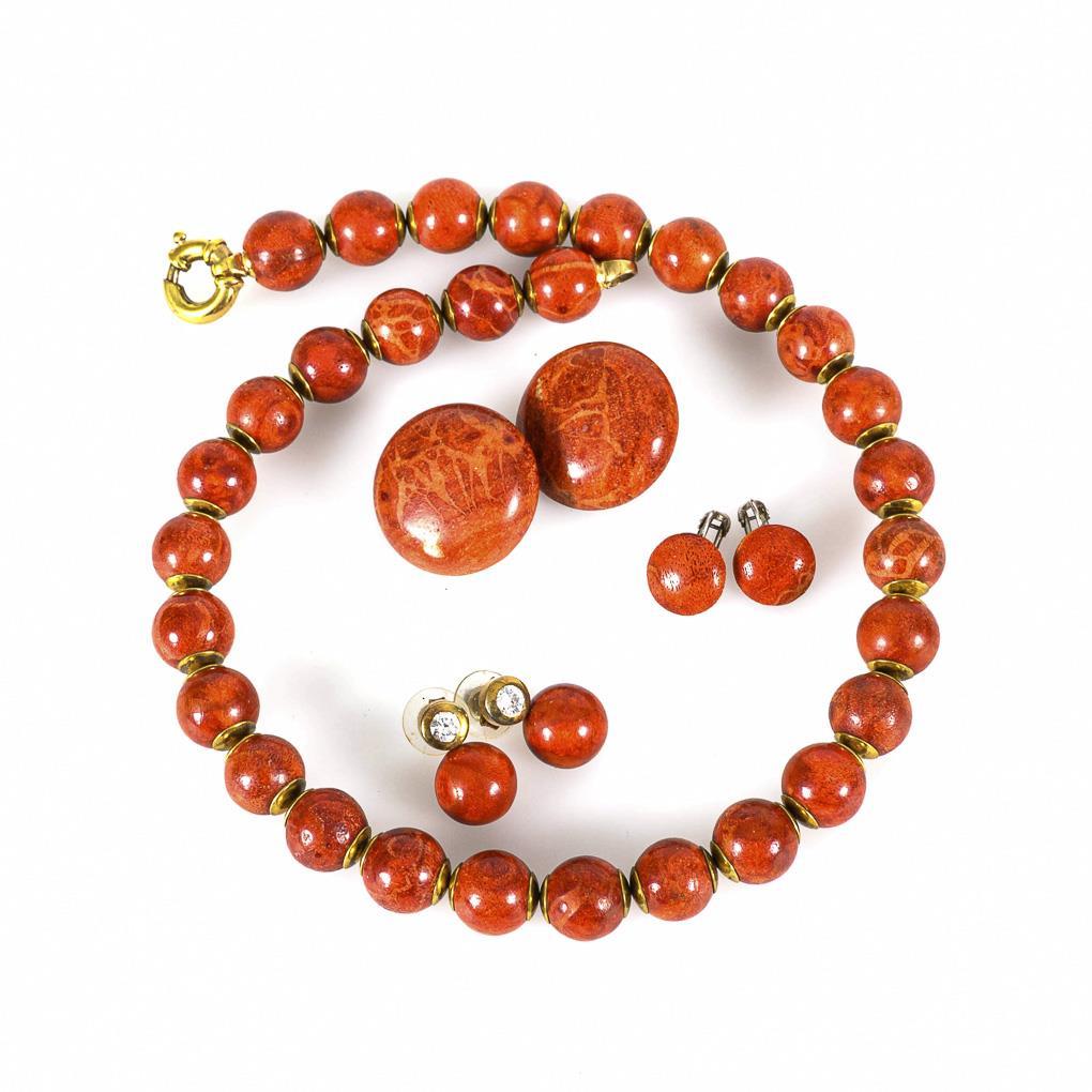 Lacing necklace, 2 pairs of earclips and pair of ear studs with foam coral.