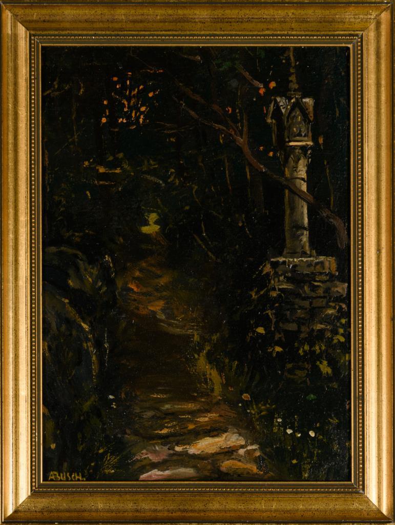 Schmaler Weg zwischen dicht stehenden Bäumen und einem Bildstock.