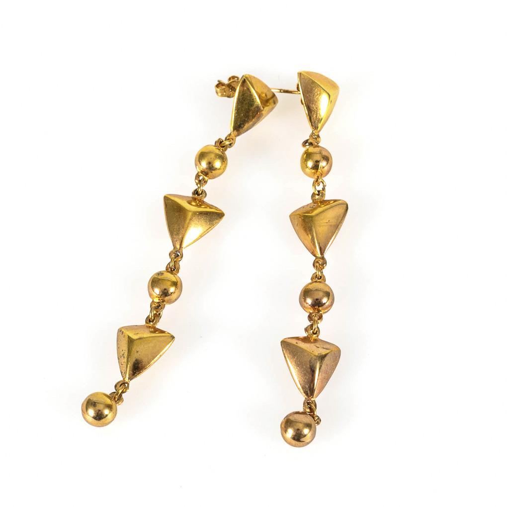 Triangular bracelet with triangle and ball suspensions in hollow form. Plug-in mechanism.