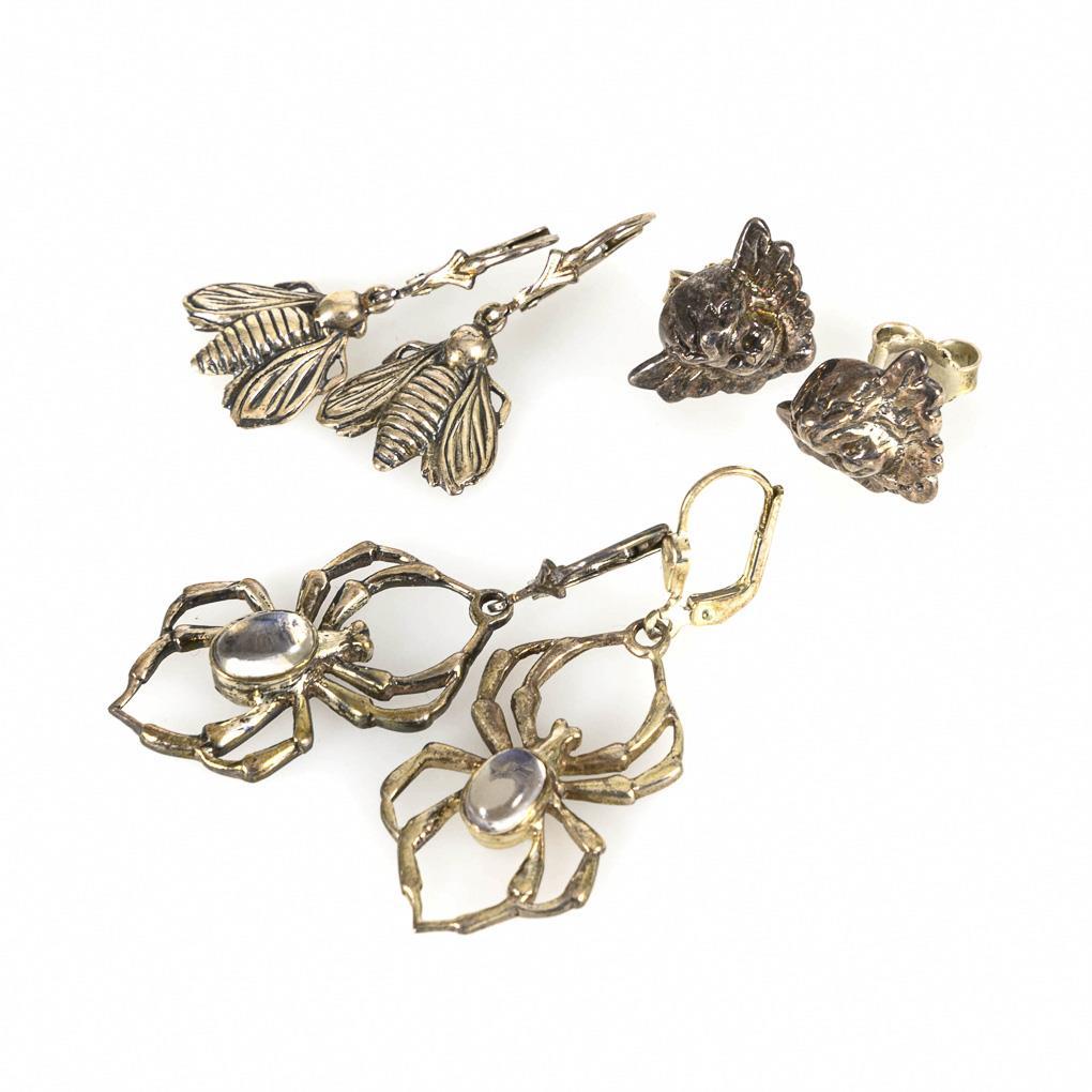 Ear studs with angel head bristle on plug-in mechanism. Pair of earrings with spider suspensions with moonstone cabochons and pair of earrings with insect suspensions. Spring hoop.