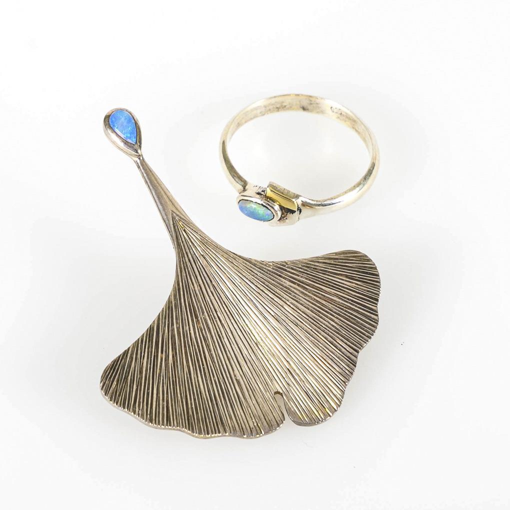 Silver 925 stamped. Brooch 4,7 x 3,8 cm. Ring size 57. 8.5/2.1 g.