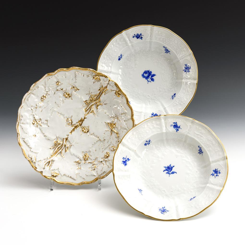 2 soup plates with floral relief and blue scattered flowers (Ø 23.5 cm). / 1 credenza plate with vine leaf relief and gold staffage (Ø 26 cm). 1x gold rubbed.