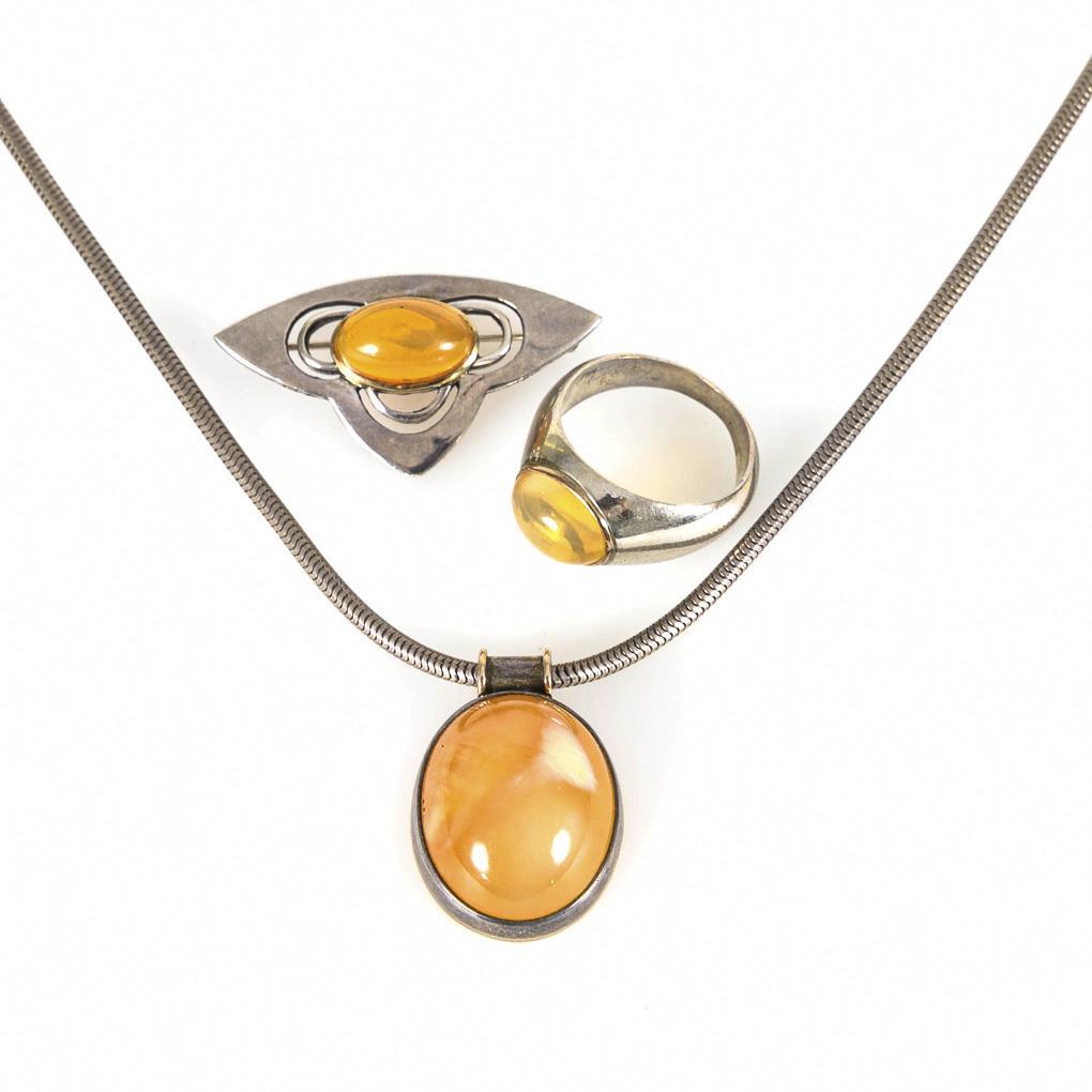 Silver 925 stamped, tested. Pendant 2.8 x 2 cm. Chain L 47 cm. Ring size 60. brooch 4 x 2 cm. 21,7/7,9/5,3 g.